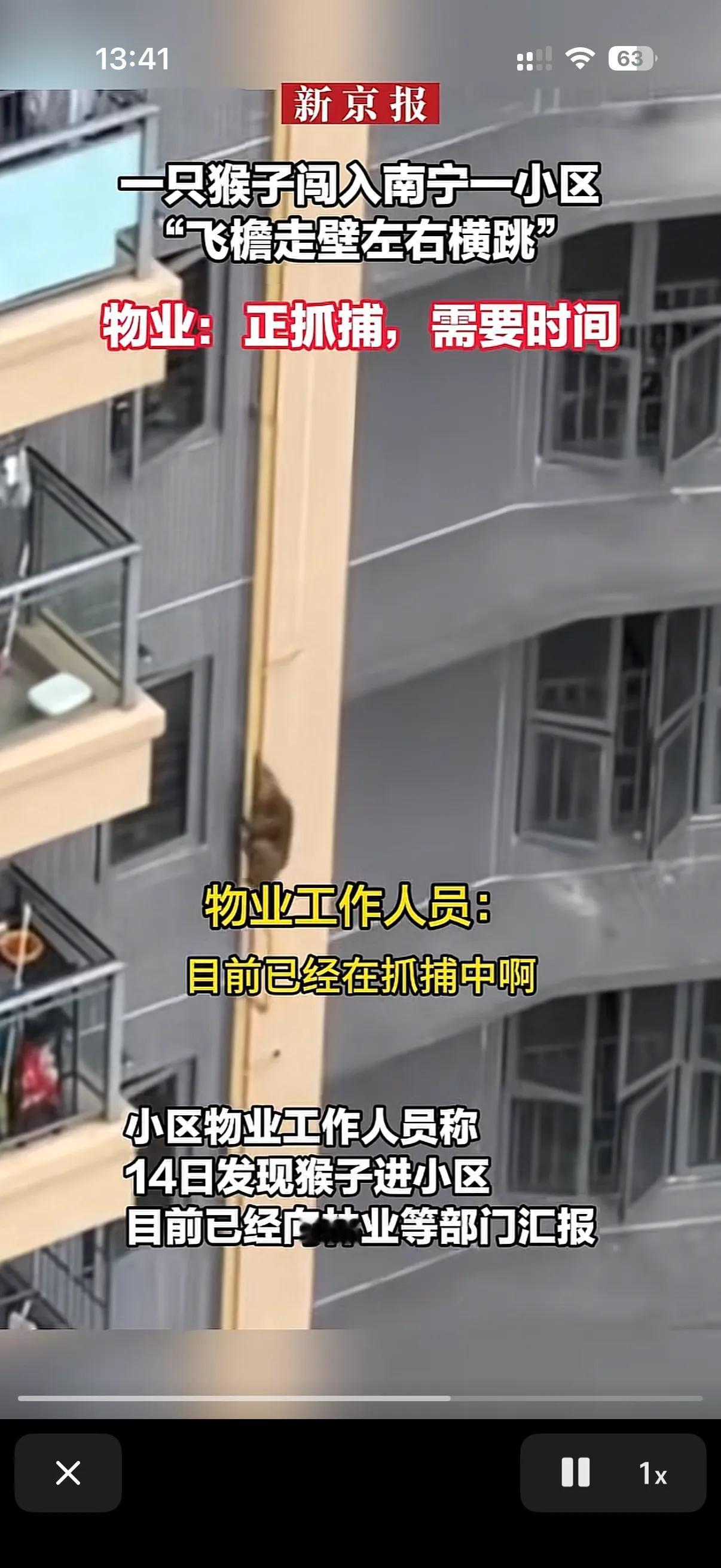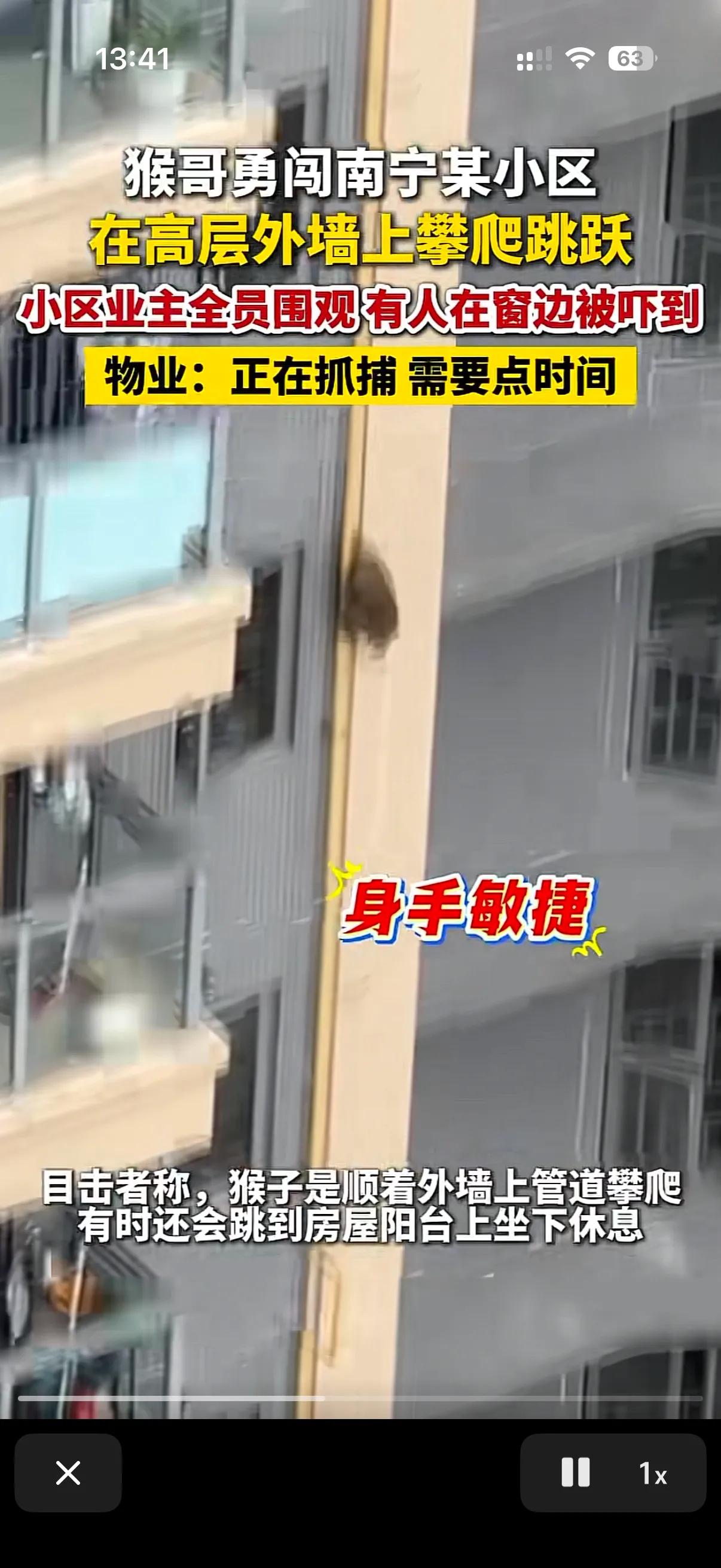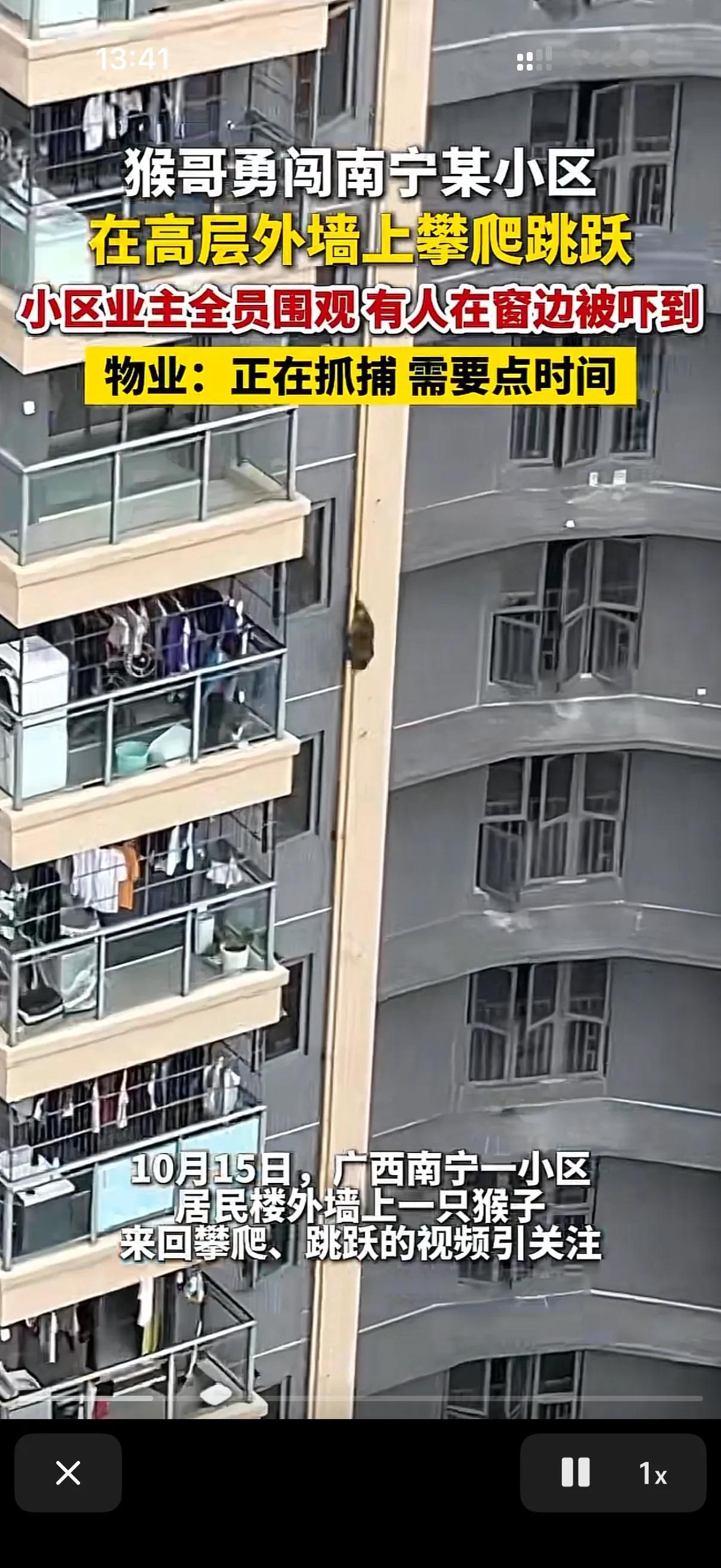 这两天广西南宁一个小区的物业表示太累了。 原来这个小区不知道从哪跑来了一只猴子!在小区里跑的上窜下跳的! 这只猴子在人们的喊声中迷失了自己,给人类表演起来了! 物业报了消防,消防抓了一晚上也没抓住这只灵活的猴子!只能是驱赶,但是这只猴子就是不离开这个小区,物业也很无奈,物业说了我们也一直在抓,无奈这猴子太狡猾了,实在是抓不住!