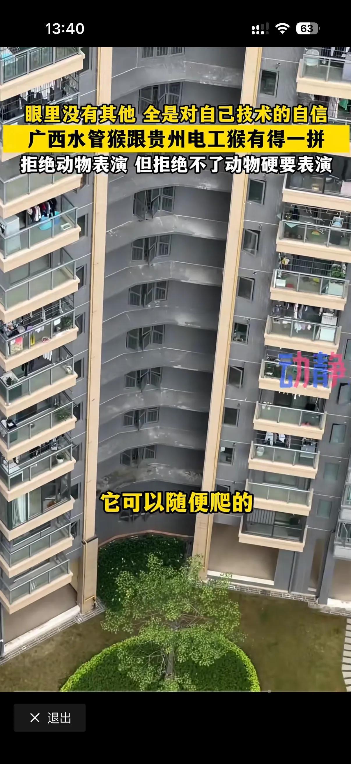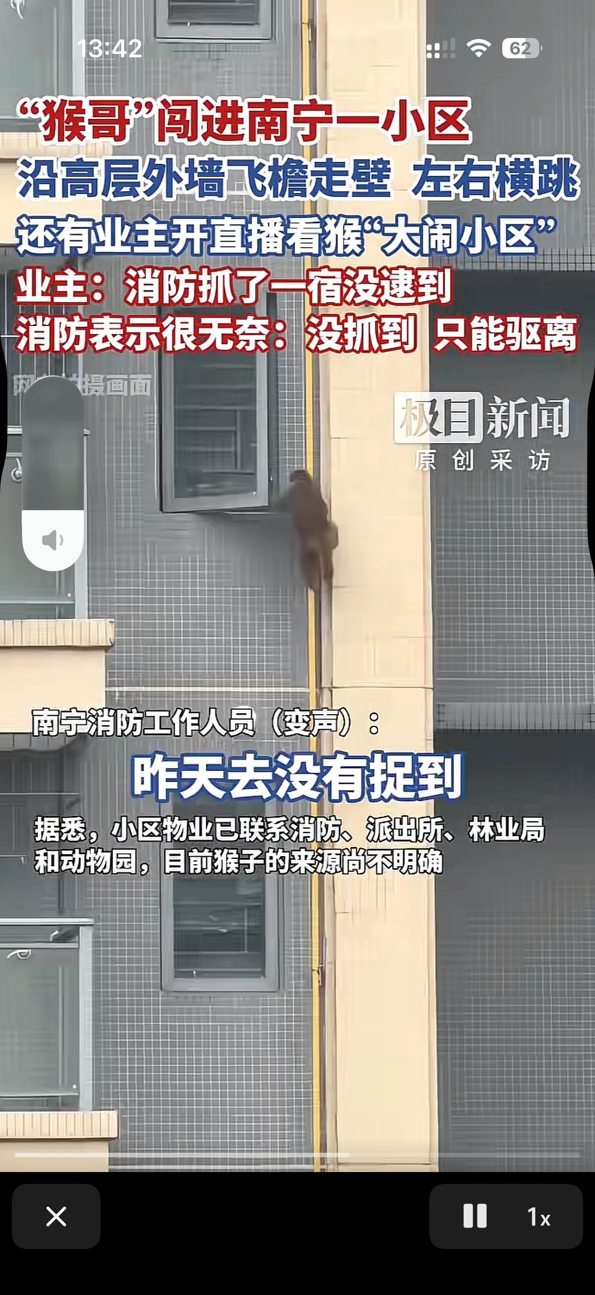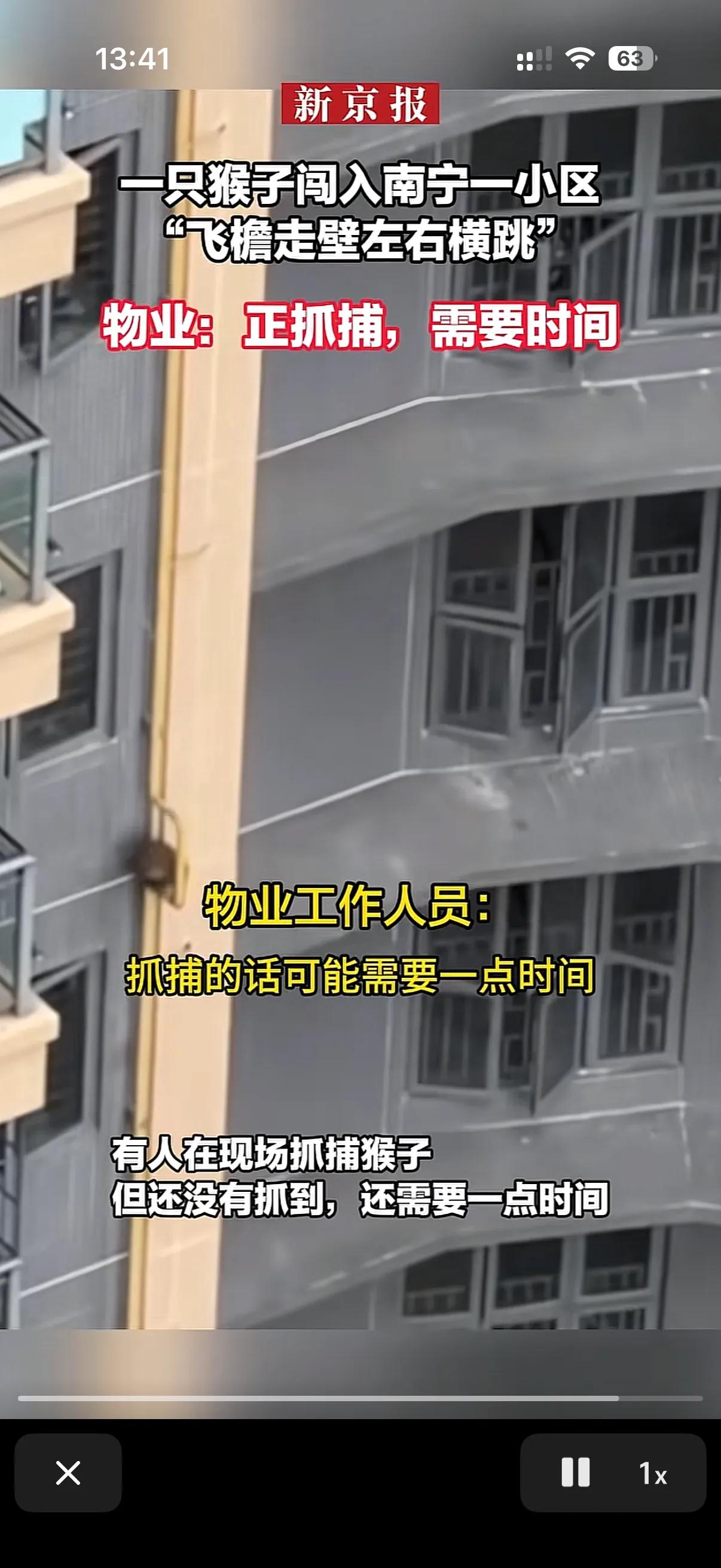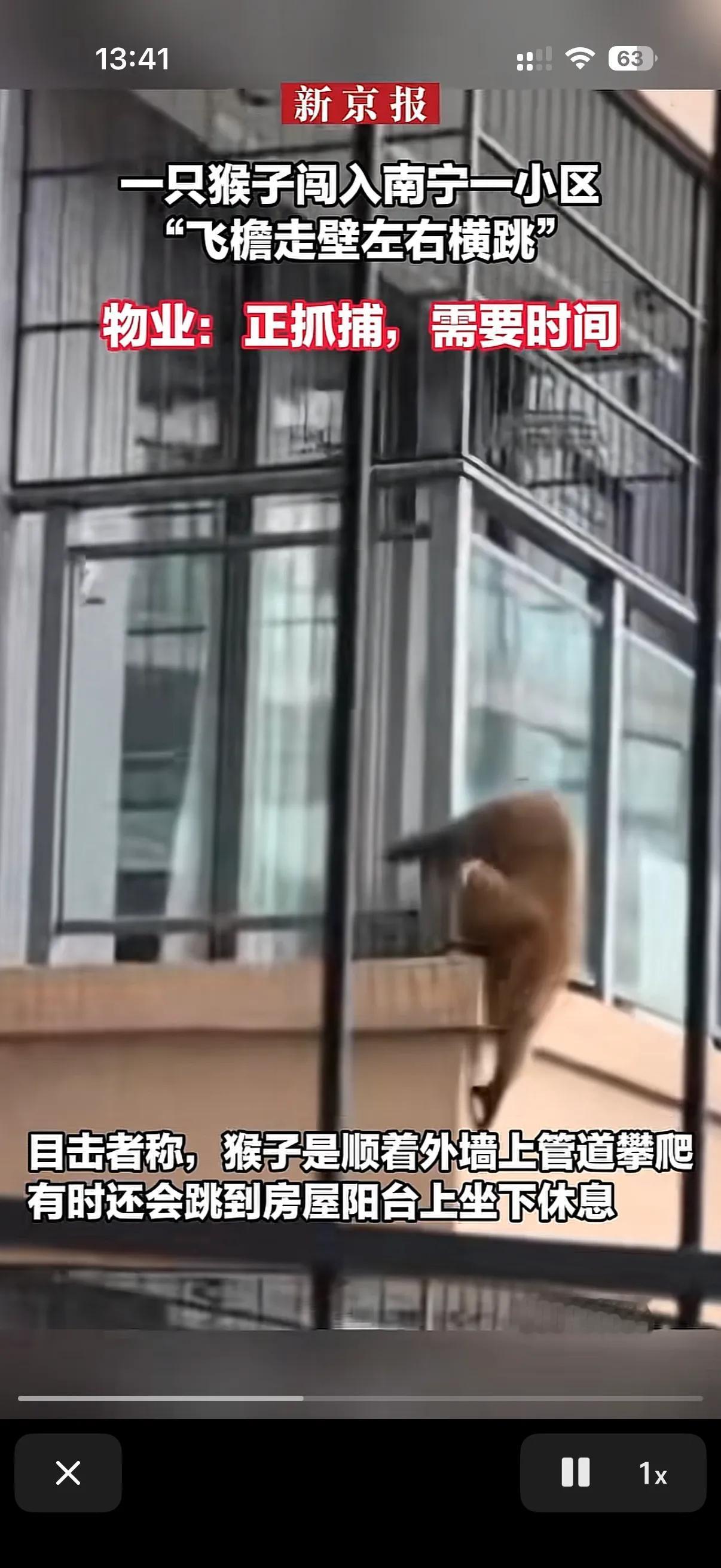 这两天广西南宁一个小区的物业表示太累了。 原来这个小区不知道从哪跑来了一只猴子!在小区里跑的上窜下跳的! 这只猴子在人们的喊声中迷失了自己,给人类表演起来了! 物业报了消防,消防抓了一晚上也没抓住这只灵活的猴子!只能是驱赶,但是这只猴子就是不离开这个小区,物业也很无奈,物业说了我们也一直在抓,无奈这猴子太狡猾了,实在是抓不住!
