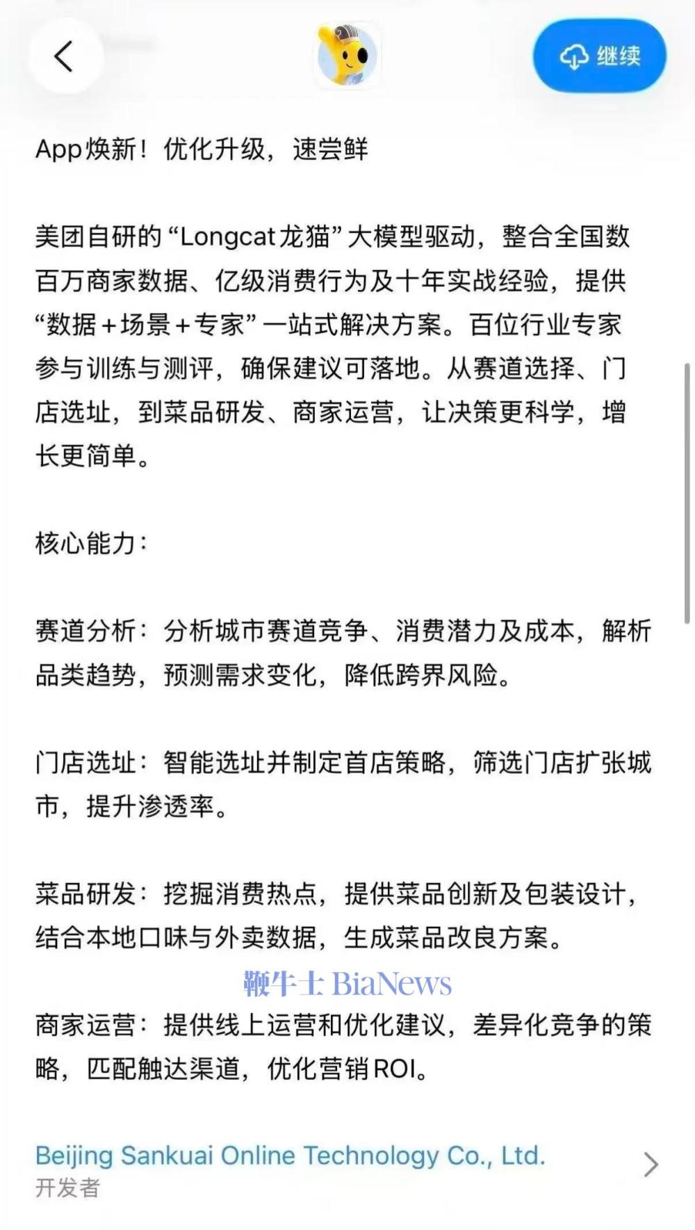 10月16日消息,美团推出效率类应用“袋鼠参谋”,该App由美团自研的“Longcat龙猫”大模型驱动,整合全国数百万商家数据、亿级消费行为及十年实战经验,为餐饮等行业商家提供“数据+场景+专家”一站式解决方案。
