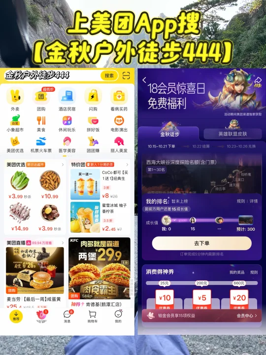 去黄山没去西海大峡谷就是白来 最近黄山的天气真的太好了 遇到云海的几率超级大 这个秋天,如果一定要爬一座山 那么我绝对推荐来爬黄山 . 1日徒步速通黄山路线 🚃【关于交通】 黄山北站,坐大巴(30元)到黄山景区,时间约一小时,建议提前一天到黄山脚下 . 🏃‍♀️【路线组合】 后山进(云谷索道)+前山下(玉屏索道)+西海大峡谷深度游 . ✅总体路线 云谷索道→始信峰→梦笔生花→猴子观海→北海宾馆→排云亭→西海大峡谷一环二环→谷底小火车→迎客松→玉屏索道 . 最近去黄山徒步别错过美团的活动,美团18会员惊喜日联合中国探险产业唯一的全国性行业协会中国徒步天花板【中国探险协会】,邀请徒步大佬带队,带美团会员黄山西海大峡谷一日大徒步,全程专业陪护,安排专业课程,传播徒步认知。 现在上美团App搜索🔍【金秋户外徒步444】参与活动,就有机会11月1号一起和美团会员们一起爬黄山西海大峡谷! 而且10月18号是美团是美团18会员惊喜日,还有一千万份免单福利大来袭~ 赶紧一起来参加吧