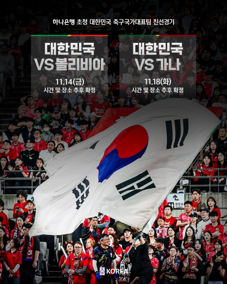 韩国队友谊赛安排:11月14日对阵玻利维亚,11月18日对阵加纳