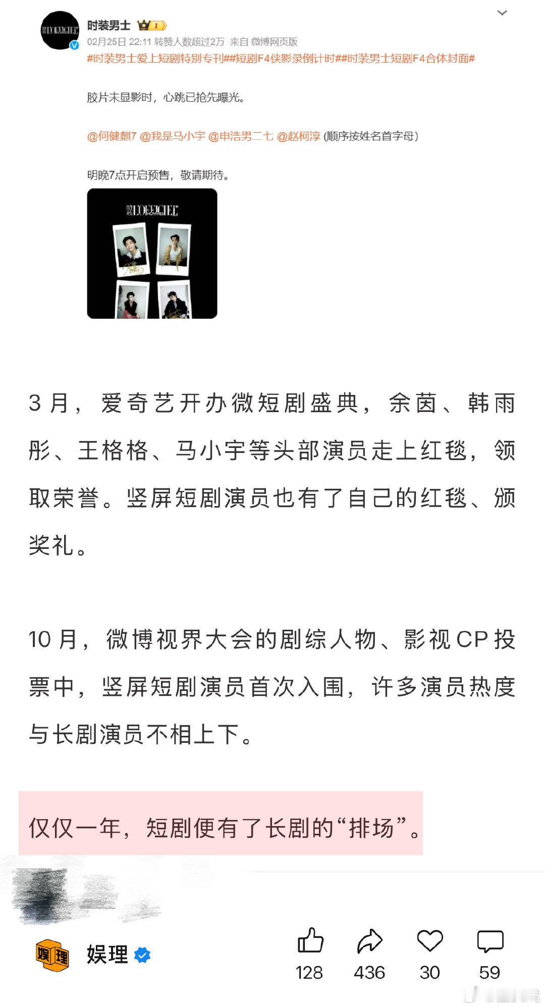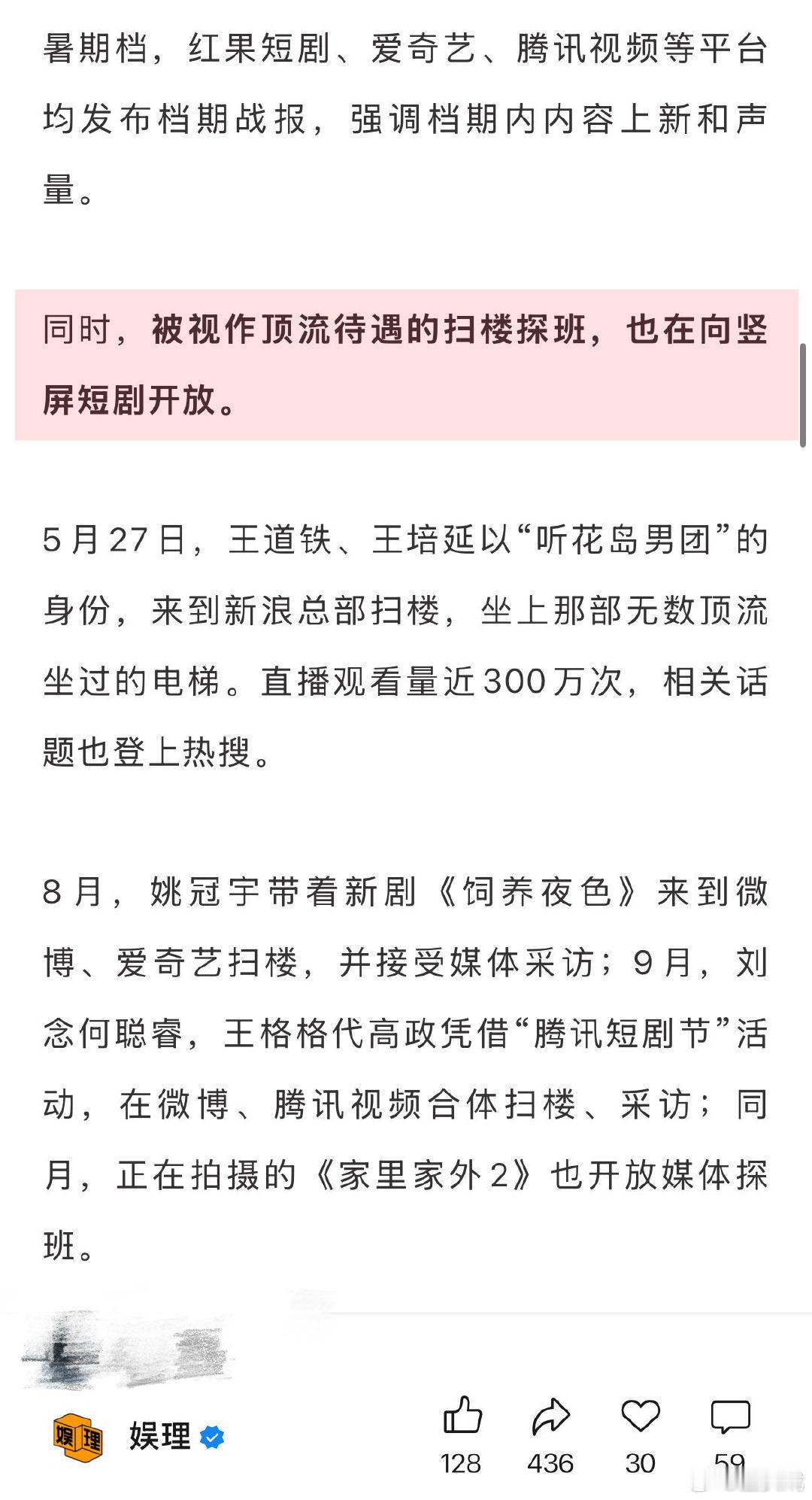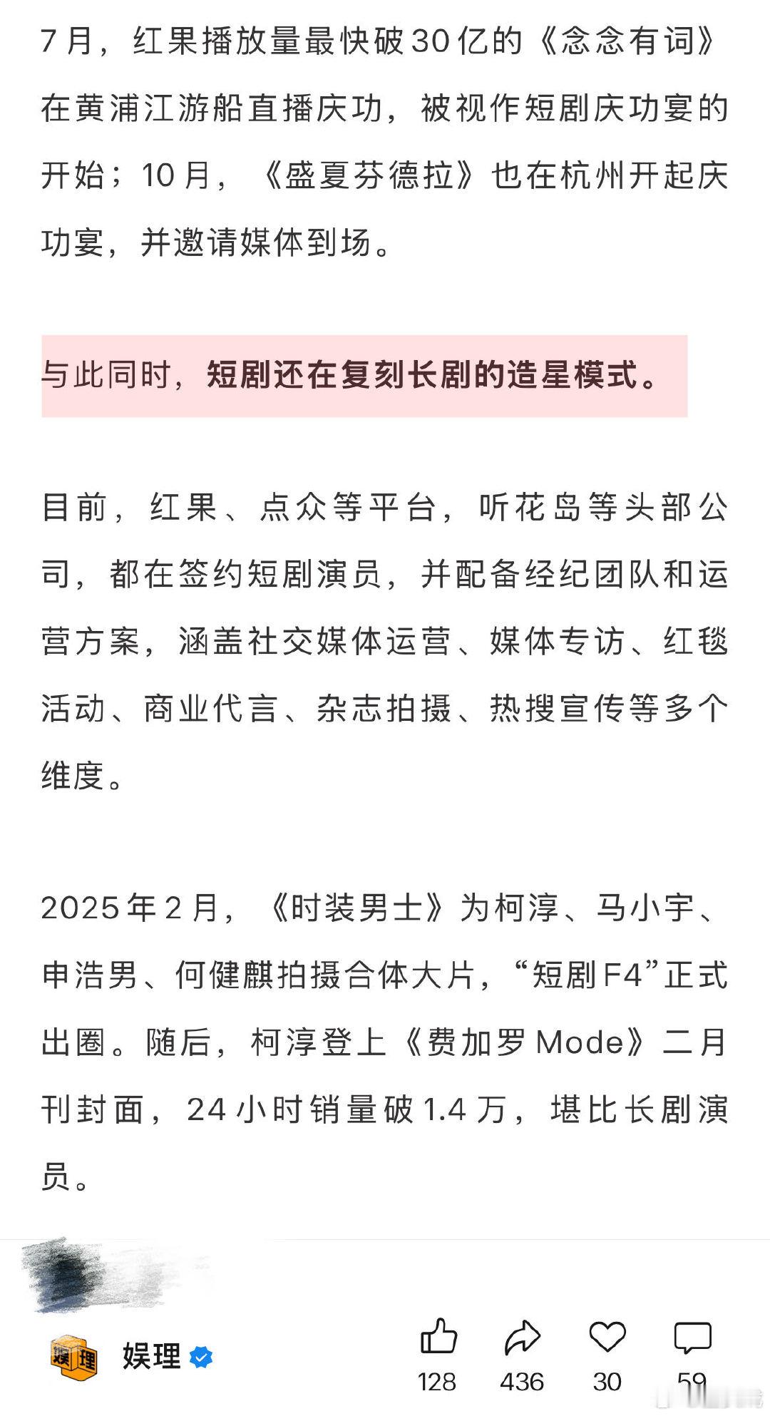 业内谈短剧宣发长剧化 短剧正在复刻长剧的造星模式 短剧正在复刻长剧的造星模式。除王道铁、姚冠宇、王格格、代高政等短剧演员参与扫楼等活动外,多个头部公司都在签约短剧演员,并配备经纪团队和运营方案,涵盖社交媒体运营、媒体专访、红毯活动、商业代言等多个维度。仅仅一年,短剧便有了长剧的“排场”…娱理独家↓