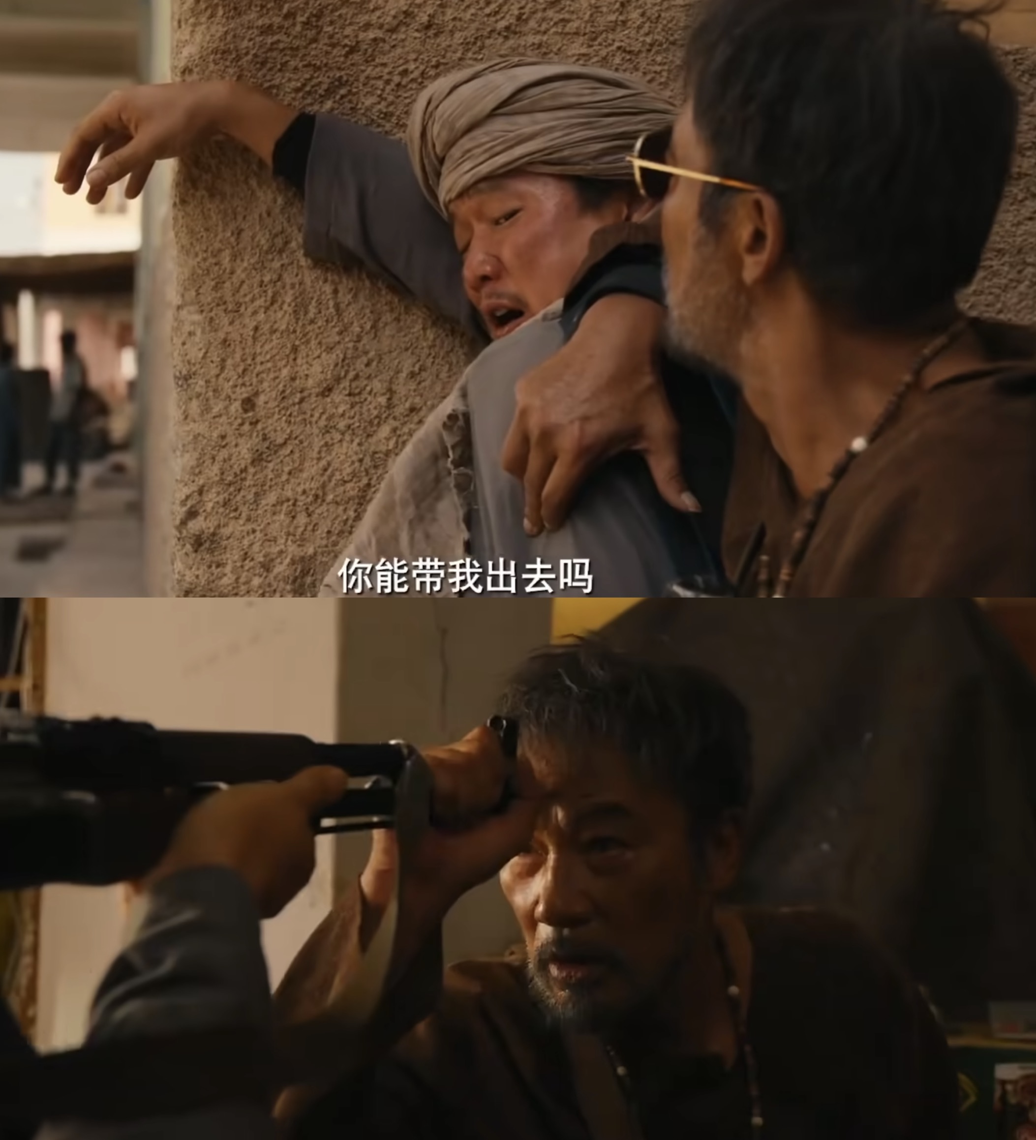 之所以说任达华饰演的周伟杰也许能成为这些人逃生的机会,也是因为可以看出他是已经融入当地环境,敢于和暴徒硬刚的人。马笑有句台词就是对周伟杰说的,希望后者能带他们这些遇难的人逃出去。而在这个残酷的战争局势下,想要逃生,就要拿起枪来对抗,可以看到有苗峰拿着枪扫射的镜头。
