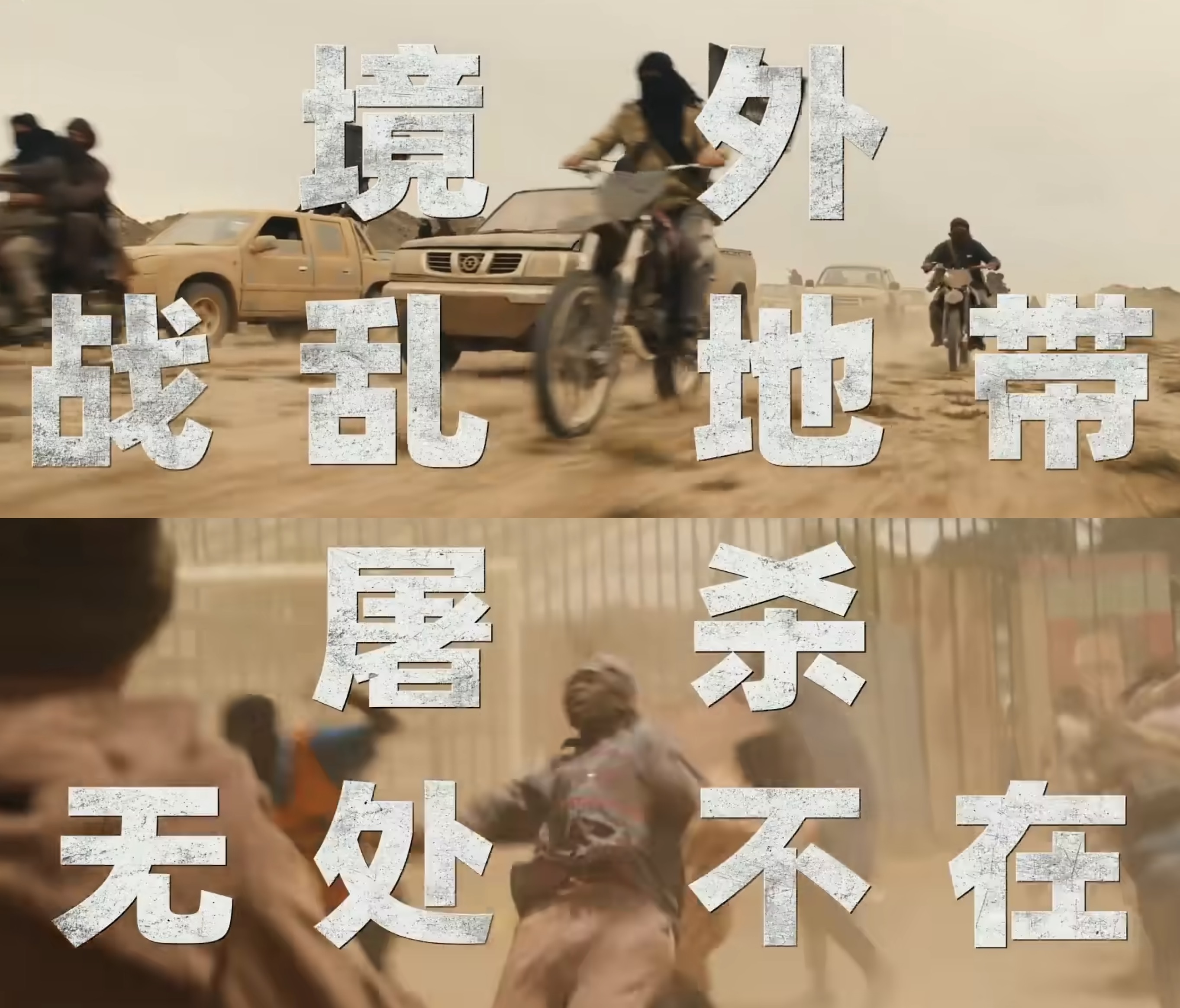 而刚才提到,被地雷炸掉双腿的人应该就是郑恺饰演的工程师苗峰,因为有肖央饰演的记者马笑背着他呼喊求救的情节。这种残酷的戏码随处可见,如预告片里呈现的那样,他们来到战乱地带,屠杀是随时都会发生的。