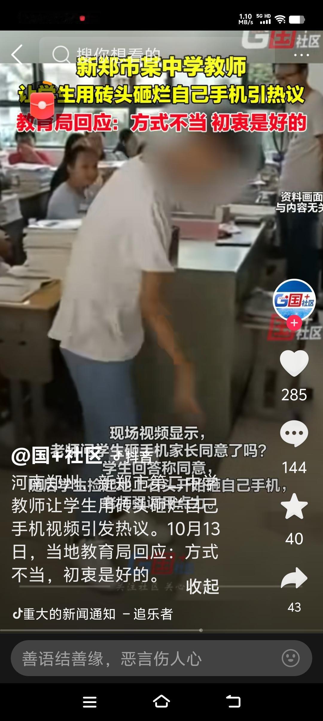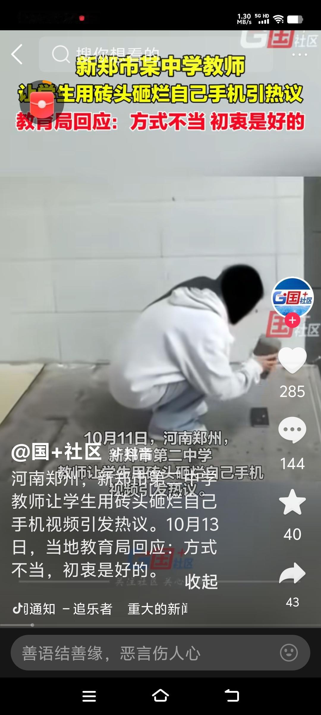 老师让学生当着全班师生的面用砖头砸手机引发争议! 河南一中学老师让学生用砖头当着全班同学的面砸烂手机, 看着一个女生蹲在地上,用砖头一下以下的拿着手机,也许女生的心里会想以后再也不要玩手机了! 另外两个男生拿起自己的手机卯足了力气向地下砸去! 老师,这样的要求到底合不合理呢? 当地教育局就此事回应,老师的初衷是好的,方式不太恰当! 评论区的网友们各持己见,大多是支持老师的做法。 因为他们的孩子也深受手机之害,手机游戏、刷短视频达到不休不眠的程度,荒废了学业,萎靡了精神,熬坏了身体! 家长们对孩子玩手机上瘾的现象,真是深恶痛绝。 一旦手机游戏上瘾,确实让孩子变得六亲不认,什么学业,什么志向,全都在手机游戏的打打杀杀声中消耗殆尽! 如果老师通过让学生自己毁坏手机,能够杜绝学生玩手机上瘾的话,也是一个好的作法,学生能够自己把手机毁坏,说明戒掉玩手机的态度和决心! 但是我们担心的是,学生把手机砸了,只是一段时间的戒掉,如果学生故伎重演的话,岂不是白白的浪费了一部手机, 手机砸了,如果再缠着父母买的话,父母可就惨了! 戒掉学生玩手机上瘾的坏习惯,确实势在必行,但是通过这种方式到底能不能根治学生玩手机值得探讨! 学生会不会头脑一热,三分钟热血,决定和手机游戏拜拜,把手机砸烂,可是过了这个热乎劲,又 重蹈覆辙! 如果真的还是戒不掉,就不是损人1千自损八百的事了,里里外外都是父母买单! 让学生戒掉手机,确实每一个老师每一个家长的共同心声,,可是想实现全部戒掉,彻底戒掉很难! 对于戒掉手机游戏这事,形式并不重要,重要的是看实效!