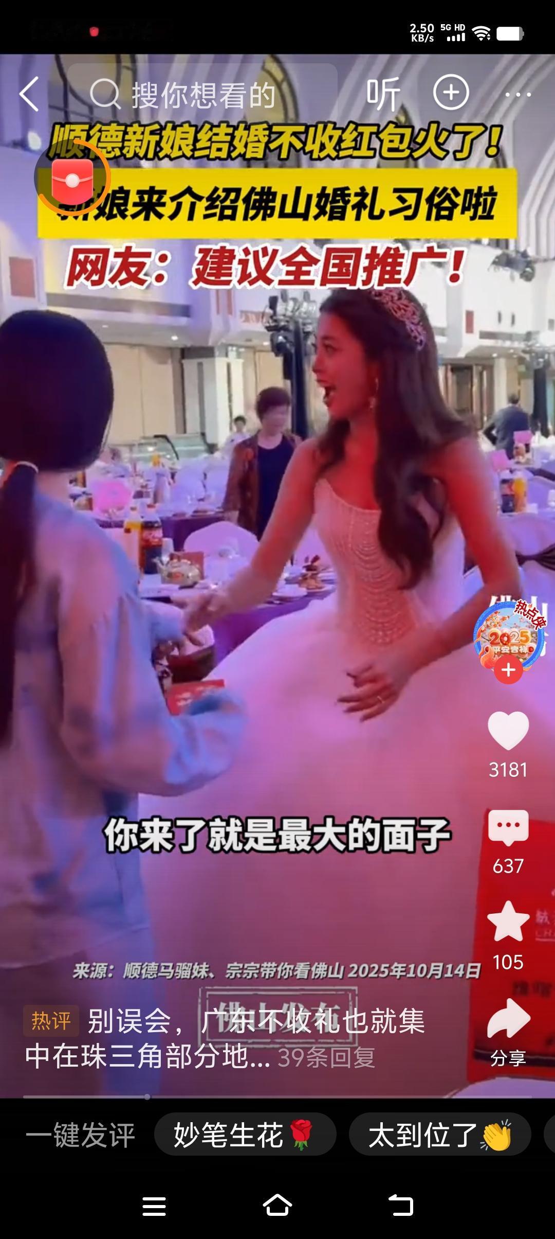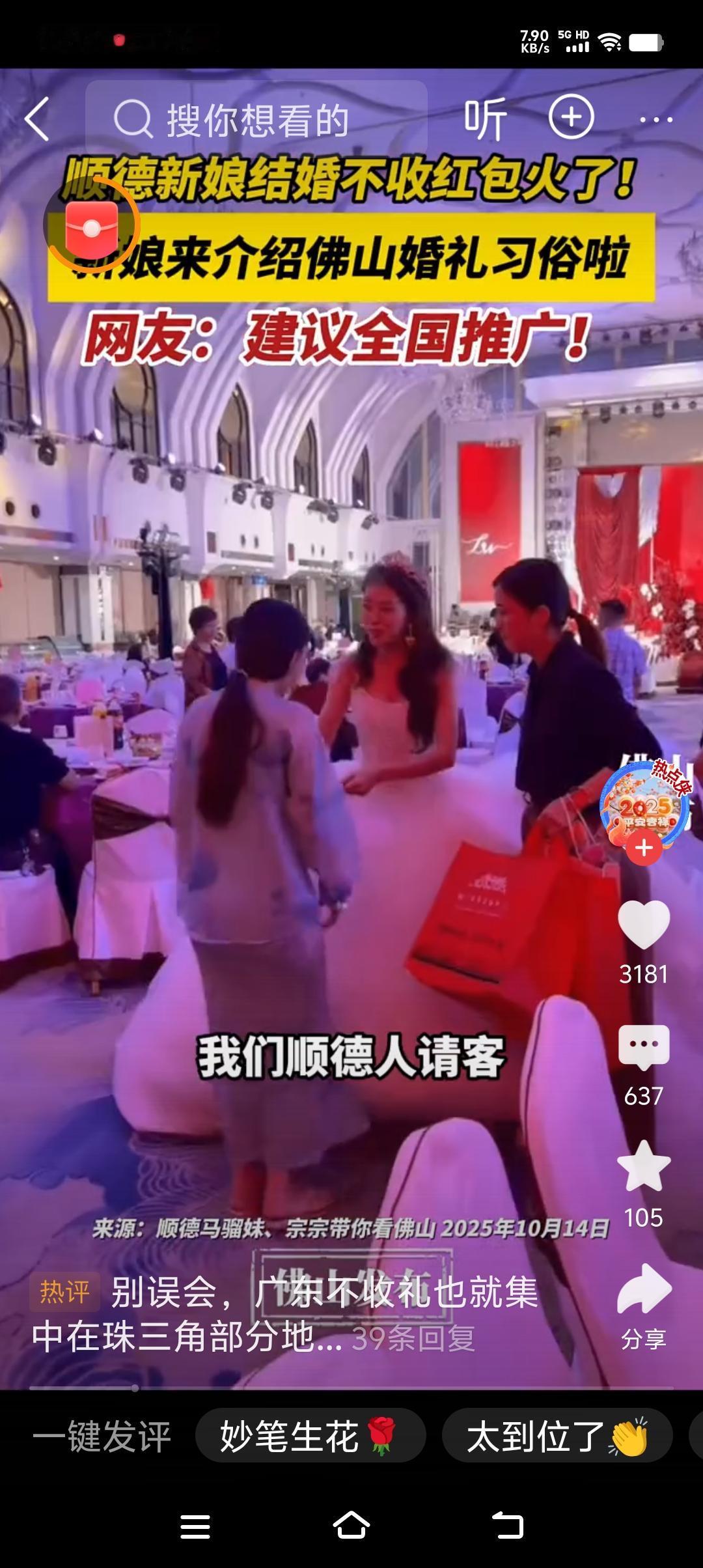 广东一位新娘婚礼不收红包, 红边网络! 视频中的不收红包的新娘说了,自己不收红包的理由, 他说如果我请你参加我的婚礼,请你吃饭,你还给我包了一个大红包,到底是谁想谁吃饭呢? 如果有的宾客过于热情,非要给红包不可那么新娘,就在红包一角处折以下,这说明心意收下礼金退回! 这样的喜事新办确实让网友们非常赞同, 因为这样的婚礼,如果全面铺开的豁免的年轻人,为了随份子,而费尽苦心, 除了忙于工作,忙着家务之外,还要记得谁给我随了多少份子?我要回答多少钱! 在老家就有这样一位村民,因为他随了别人份子,可是他家儿子办喜事的时候,好几个人却没有前往还礼,他一气之下,在家里喜事办完之后,去那几个欠他礼金的人家,就挨家挨户的再次 请客,而且是亲身造访! 随礼,一旦随到这个程度,就没有人情味儿了, 只是为了金钱往来而已,这样的随份子根本没有任何意义,没有发自内心的忠心祝福,而是都为了钱! 也有的亲戚朋友之间,因为相互还礼, 而闹矛盾的, 本来相互随礼是为了增进亲戚朋友之间的感情,如果因为钱而闹了别扭,这样的水里,根本没有必要,所以有些老的传统习俗, 不利于亲戚朋友之间增进感情的可以废除! 广东新娘的做法,确实值得人们反思,人家收下祝福还回礼金,这样的做法,真的应该宣传普及!