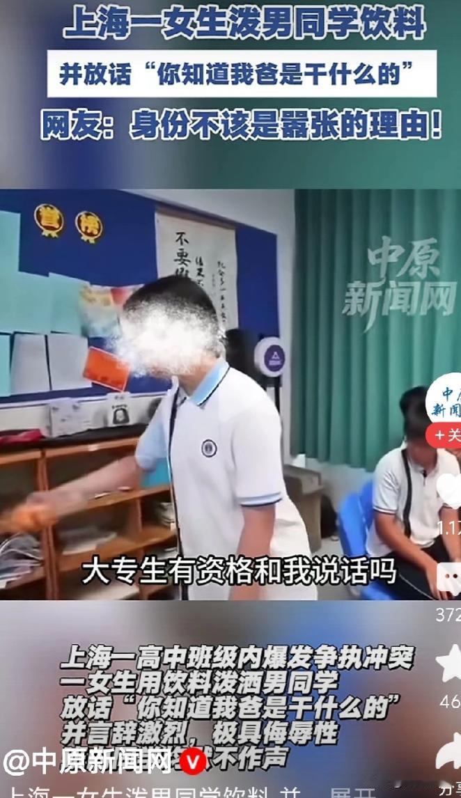 上海,一女生不仅高喊着我是高一的,随时来找我,并羞辱对方:“我一点不好惹,你一个大专生有什么资格跟我说话,你知道我爸是干什么的么?说完还拿饮料往男生身上泼。忍无可忍男生开始动手反击,随后被同学拉开。 上海这边,前段时间有个高中教室里的事,传得挺广,看完让人心里堵得慌,本来就是普通的课间,教室里还有同学在收拾书本、小声聊天,没成想突然就起了冲突,主角是一个女生和一个男生,那女生的态度简直嚣张得让人咋舌。 一开始女生就对着男生不依不饶,声音又大又冲,一边说还一边往男生跟前凑,嘴里还扬着嗓子放话:“我是高一的,你记好了,以后随时来找我!” 那架势完全是一副 “我不好惹” 的模样,周围几个同学听见动静,都停下手里的事看过来,可没人敢上前劝一句。 接着女生的话就更难听了,对着男生劈头盖脸地羞辱:“你一个大专生,有什么资格跟我说话?” 这话一出口周围一下子就静下来了,连之前小声的议论都没了。 可女生还没完,又抛出一句更让人心里发沉的话:“你知道我爸是干什么的么?” 说这话的时候,她眼神里带着一股子不屑,仿佛这句话就能把男生压得抬不起头。 没等男生回应,女生直接拿起桌上的饮料,有黄色的、还有黑色的,一瓶接一瓶地往男生脸上、身上泼,冰凉的饮料顺着男生的头发往下淌,衣服很快就湿了一大片,黏在身上看着都难受。 男生一开始还忍着,攥着拳头没动,可女生泼了好几瓶,嘴里的羞辱也没停,他脸上的表情越来越难看,显然是快忍不住了。 周围的同学就这么看着,有人低下头假装没看见,有人还在偷偷用手机拍,就是没人敢站出来拦一下,连门边好像有老师经过,瞅了一眼里面的情况,也没进来就那么走了。 整个教室静得奇怪,只有女生的声音和饮料瓶碰撞的声音,那股子压抑劲儿,隔着屏幕都能感觉到,终于男生忍到了头,情绪一下子爆发了,伸手就朝着女生冲过去,甚至有了锁喉的动作。 看得出来他是真被逼急了,可就在这时候,之前一直没动静的几个同学,包括后来网友们反复提到的那个戴眼镜的男生,一下子都围了上来,使劲儿把男生往旁边拉,有人还按着他的胳膊,生怕他再往前冲。 可有意思的是,没人去拦那个还在气头上的女生,她就站在一边看着男生被拉开,脸上甚至还有点得意,这场景明眼人一看就明白,哪是正经劝架啊,分明就是 “拉偏架”,之前女生欺负人的时候没人管,男生一反击,倒有人出来 “维持秩序” 了。 后来这事听说是以 “私下协商和解” 收场,可网上的议论一点没少,反而越来越多,有人说男生太冲动不该动手,但更多人觉得憋屈,替那个男生抱不平,被人羞辱又泼饮料换谁能一直忍? 大家的疑问也一堆堆的,那个女生嘴里说的 “我爸是干什么的”,到底她爸是啥身份,能让她在学校里这么肆无忌惮?还有为啥网上流传的视频里,施暴的女生脸上打了马赛克,被欺负的男生却露着脸?这算啥事儿啊,难道因为女生家里可能有背景就能这么双标? 其实大家追问的根本不是什么八卦,是想弄明白难道有权力或者背景,就能明目张胆地欺负人,最后还能悄无声儿地把事儿压下去? 这可不是简单的校园冲突了,更让人寒心的是周围人的态度,老师不管同学沉默,只有在受害者反击时,才有人跳出来 “拉偏架”。 大家在意的不是这一件事的结果,是想看到个公平,不管家里是什么情况,做错了就是做错了,不能因为背景特殊,就可以欺负人还不用担责,要是连校园里都讲不通这个理,那才是真的让人担心。 (信息来源:中原新闻网2025年10月15日——上海一女生泼男同学饮料 并放话“你知道我爸是干什么的”)