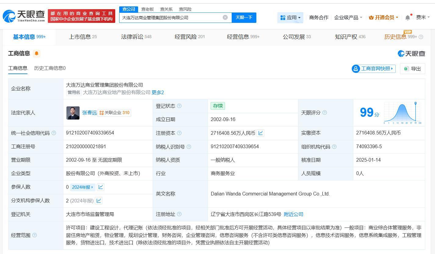 天眼查App显示,10月15日,大连润者企业管理有限公司、大连润事企业管理有限公司、大连润呈企业管理有限公司、大连润志企业管理有限公司、大连润竟企业管理有限公司成立,法定代表人均为李大伟,注册资本均为1000万人民币,经营范围为企业总部管理、企业管理咨询、以自有资金从事投资活动。股东信息显示,上述五家公司均由大连万达商业管理集团股份有限公司全资持股。