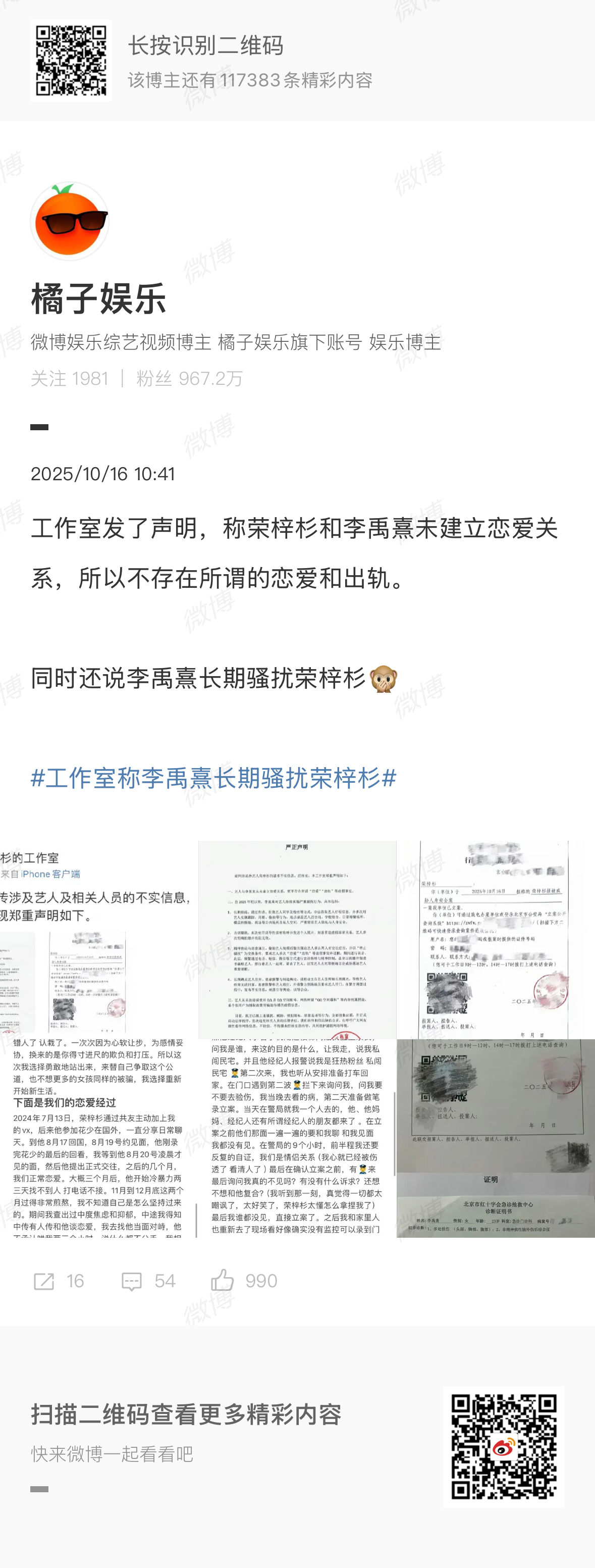 荣梓杉方的声明称双方未建立恋爱关系,是李禹熹长期骚扰跟踪荣梓杉(p8)