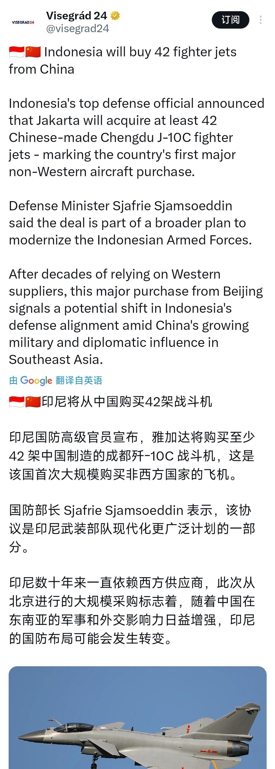 外媒今天(10月16日)报道:印尼将购买42架中国成都歼-10C战斗机,价值超过90亿美元。印尼国防高级官员表示,这是该国首次大规模购买非西方国家的飞机。 [机智]评几句:印尼将斥资超90亿美元购42架歼-10C,此举意义非凡。J-10C可不是徒有虚名的“花架子”,它是实打实在实战环境中检验出优异性能的“空中利刃”。在复杂多变的空战场景里,其先进的航电系统、卓越的机动性能以及强大的武器挂载能力,都经受住了严苛考验。一定程度上,这得感谢印度空军和法国阵风战机。