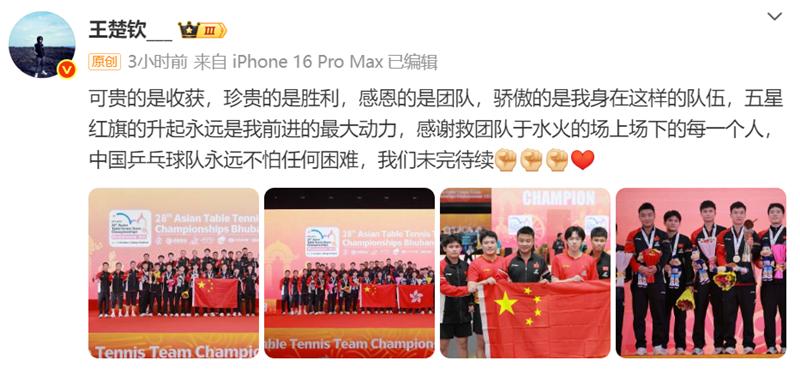 每次看王楚钦的赛后总结都充满了力量! 10月16日,亚锦赛落幕,国乒包揽双冠,队员也在归来的路上,王楚钦也更新动态,总结了这次印度之旅的所感所想。 大头说五星红旗的升起,就是自己永远前进的动力,这话听着真是动人,满满的国家荣誉感。 他也再次重申,国乒永远不惧任何困难,担当与责任尽显。 最后感谢所有人,未完待续,未来可期! 不得不赞叹,看完之后,瞬间能量爆棚,斗志拉满,这就是大头带来的精神力量,好好休息,好好恢复,让我们期待下个赛场再见!