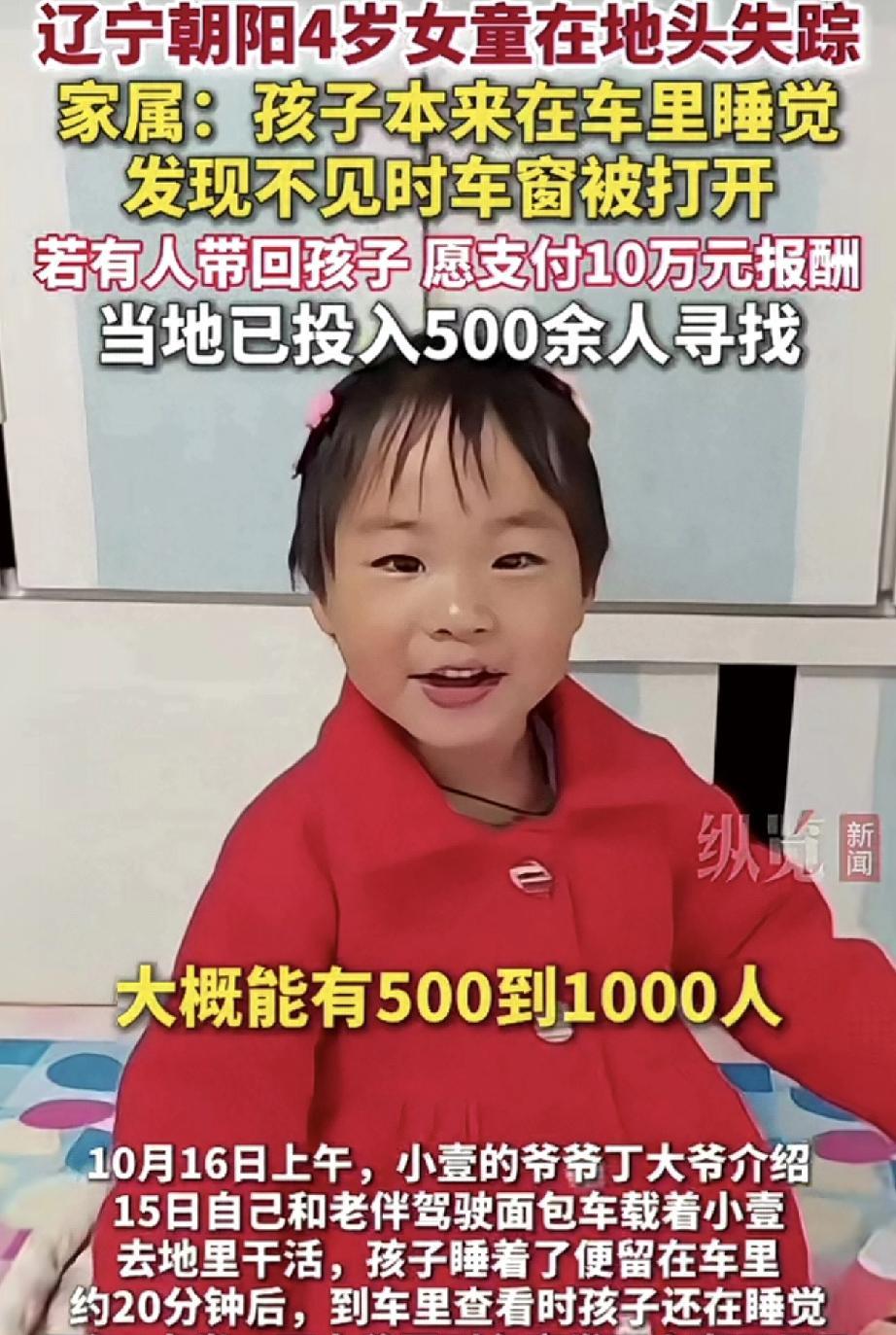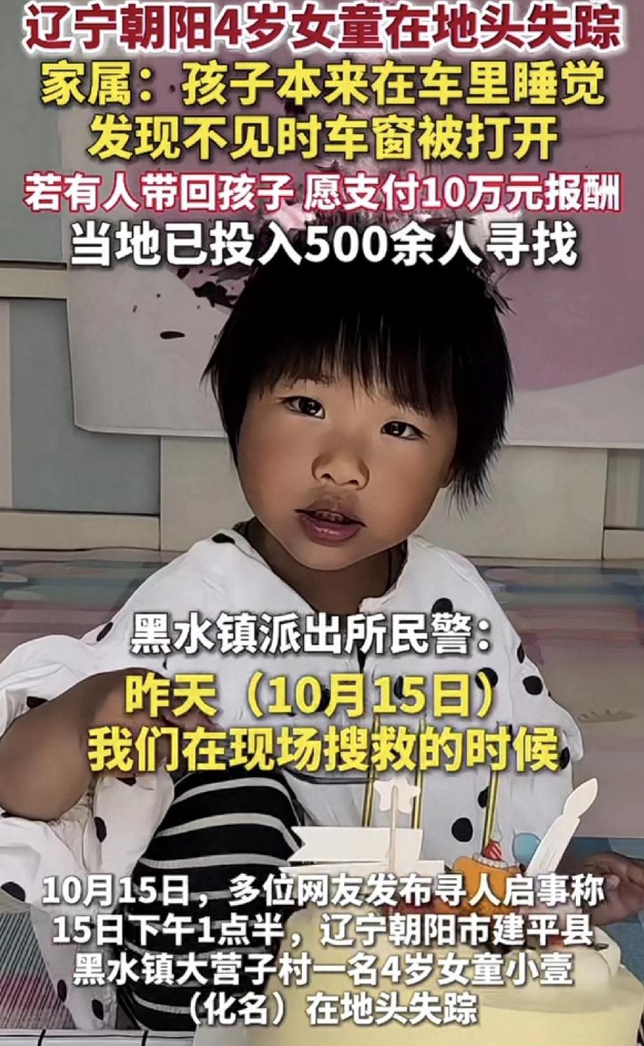 揪心!10月15日,辽宁朝阳市建平县黑水镇大营子村,一名4岁女孩坐着爷爷开的面包车一起去地里玩耍,结果刚到地头孩子便在车里睡着了,于是爷爷奶奶便把女孩留在面包车里睡觉,他们则去地里干活了,但让他们没有想到的是,20多分钟后,爷爷再去车辆看孩子时,竟发现车窗被打开,孩子也早已不见了踪影。 据女孩爷爷描述,当时女孩独自在车里睡觉时,原本车窗是关着的,但发现女孩不见时,车门虽然没有打开,但车窗却被打开了。 而且他们干活的地方,离面包车停的位置大概只有200米,中间更是没有任何遮挡物,但因为要弯腰干活,就没有一直关注车那边的情况。 目前,当地相关部门及当地村民已投入500余人帮忙寻找女孩,甚至已使用了无人机、热成像等搜寻,但仍未发现孩子走失的线索。目前大家还在积极寻找女孩中。 女孩的爸爸也表示,生活中也并没有得罪任何人,或是有什么仇家,但女孩却就这样凭空消失了,为此一家人也是担心不已。他们也表示,若有人能将女孩找到并带回,他愿意支付10万元报酬。 太让人揪心了,短短二十多分钟的时间,孩子竟然就像人间蒸发一般,这对女孩的家人来说得有多么担心啊,希望大家搜索时不要漏了任何一个细节,如果真是坏人所为,简直就是猖狂到极点了!必须严惩不贷!希望女孩早日平安归来!