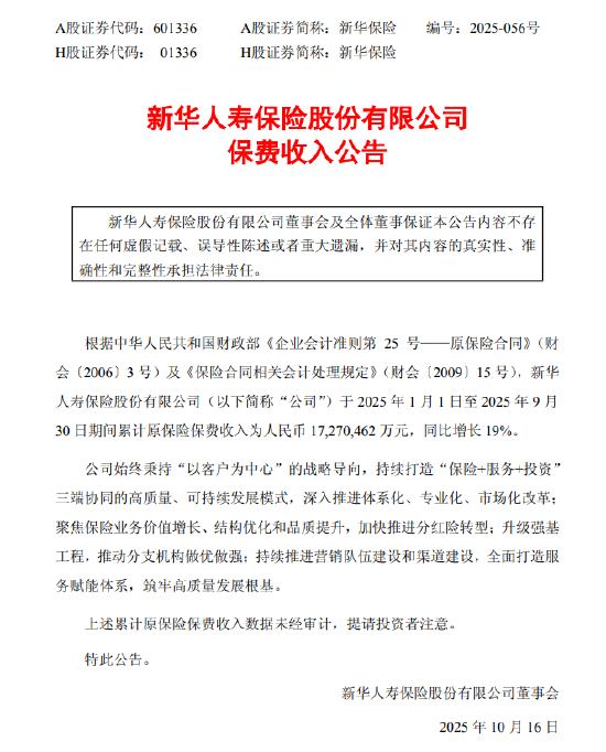 10月16日金融一线消息,新华保险发布公告,公司于2025年1月1日至2025年9月30日期间累计原保险保费收入为1727.05亿元,同比增长19%。该数据未经审计。