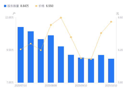 日期A股户数(户)流通A股户均持股数(股)户均持股市值(万元)2025-10-108838021853.0214.312025-09-309125721164.0813.572025-09-198848721826.6013.292025-09-108926721635.8813.202025-08-299140021130.9613.442025-08-209791019725.9713.022025-08-0810641518149.4211.822025-07-3110345818668.1611.572025-07-1810949817638.4011.082025-07-1011280917120.7110.63