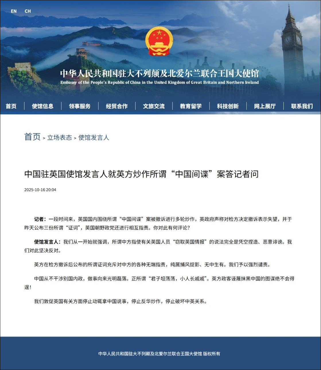 中国驻英国使馆发言人就英方炒作所谓“中国间谍”案答记者问