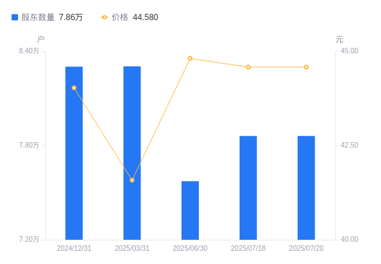 日期A股户数(户)流通A股户均持股数(股)户均持股市值(万元)2025-07-20786126176.6727.542025-07-18786126176.6727.542025-06-30757316411.6528.732025-03-31830425847.1724.312024-12-31830215669.2224.962024-09-304324610883.2841.152024-06-304198411116.9029.982024-06-284198411116.9029.982024-03-313324613785.6146.042024-03-083549812707.9139.06