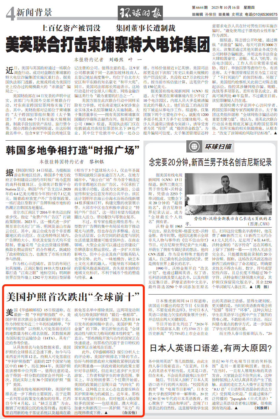 美国《华盛顿邮报》15日报道称,在最新一期“亨利护照指数”中,美国护照首次跌出全球最强护照前十名。作为持续发布近二十年的权威榜单,“亨利护照指数”以持照人可免签前往的目的地数量为核心排名依据,其数据来源为国际航空运输协会(IATA),具有广泛的参考价值。