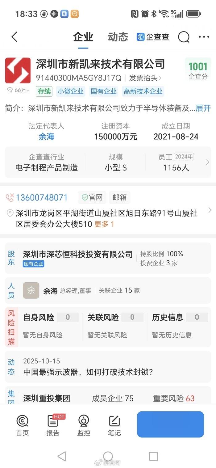 企查查显示,新凯来2021年8月在深圳龙岗区注册成立,注册资本15亿元,法定代表人余海,是一家致力于半导体装备及零部件、电子制造设备的研发、制造、销售与服务的公司,相关产品广泛应用于国内顶级制造企业和研究、测试机构。