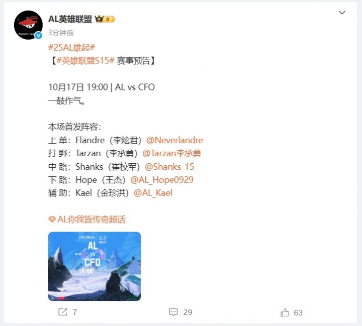 直播吧10月16日讯LPL二号种子AL将在明天交手CFO,俱乐部公布了本场Bo3的赛前海报: