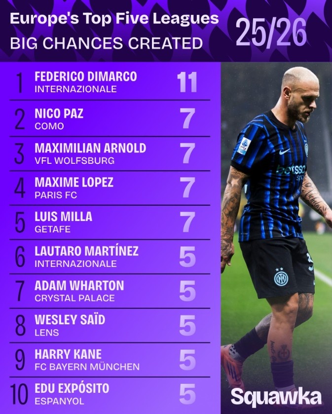 直播吧10月17日讯本周末,欧洲五大联赛将重燃战火。Squawka盘点了本赛季五大联赛创造重大机会情况,其中迪马尔科以11次居首,尼科-帕斯等4人均7次紧随其后。