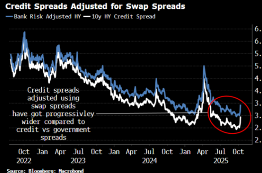 至少此前它们开始显得更安全。近期在贸易紧张局势再起,以及FirstBrands破产之后,利差已经走阔。正如摩根大通首席执行官杰米·戴蒙提醒我们的那样,如果你看到一只蟑螂,就很可能还会看到别的。