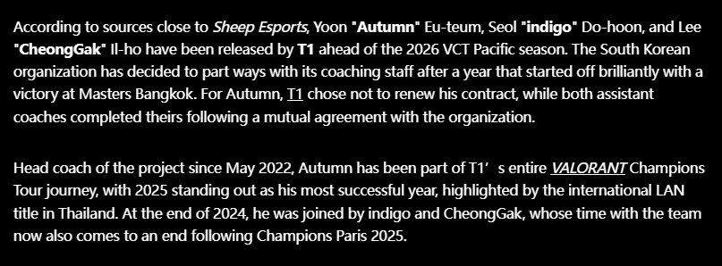 "据SheepEsports的消息源透露,Autumn、indigo和CheongGak已在2026年VCT太平洋赛季开始前被T1解约。T1决定与教练团队解约,此前他们经历了辉煌的一年,并在曼谷大师赛上夺冠。对于Autumn,T1选择不再续约,而两位助理教练则在与俱乐部达成一致后结束了合同。