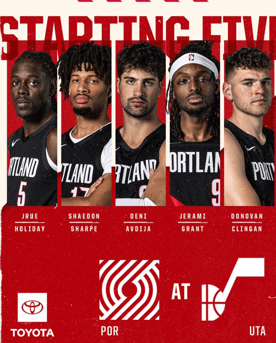 赛前,开拓者公布球队本场首发阵容:朱-霍勒迪、谢登-夏普、德尼-阿夫迪亚、杰拉米-格兰特和多诺万-克林根。