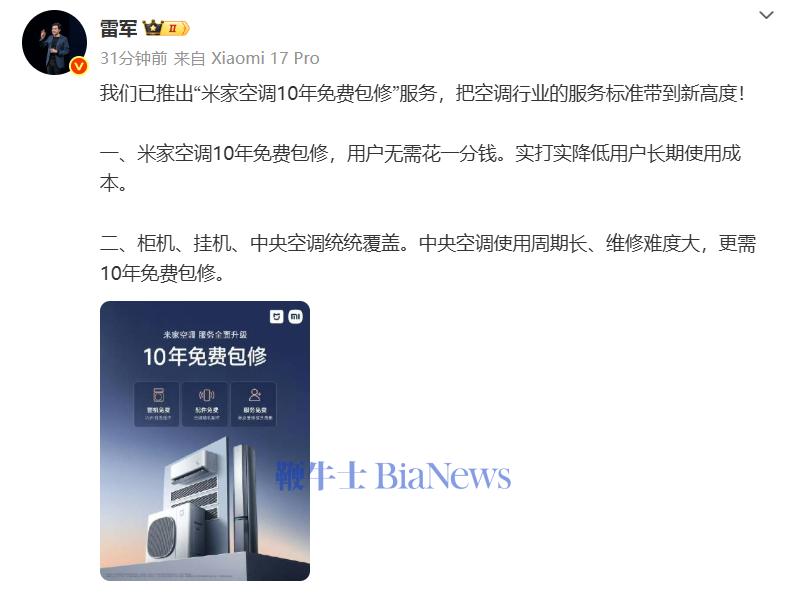 10月17日,雷军发文称,小米已推出“米家空调10年免费包修”服务,把空调行业的服务标准带到新高度。
