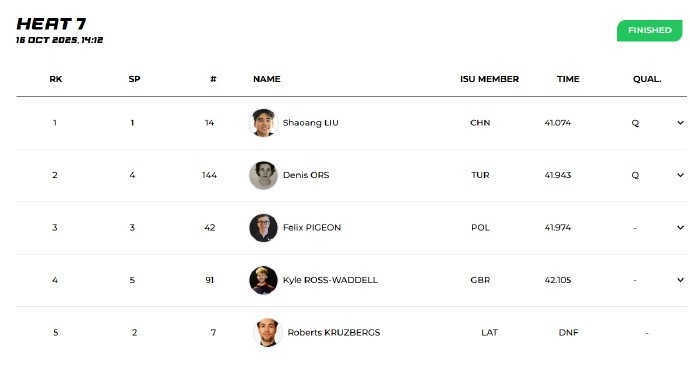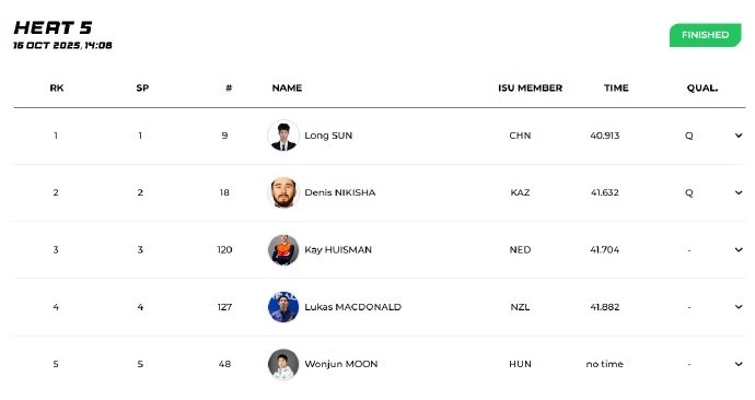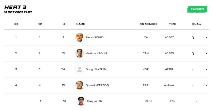 第三组出战的林孝埈和法国选手一起摔出赛道,赛后被判犯规。第五组出场的孙龙40.913小组第一晋级,第七组出战的刘少昂41.074,同样以小组第一身份晋级。