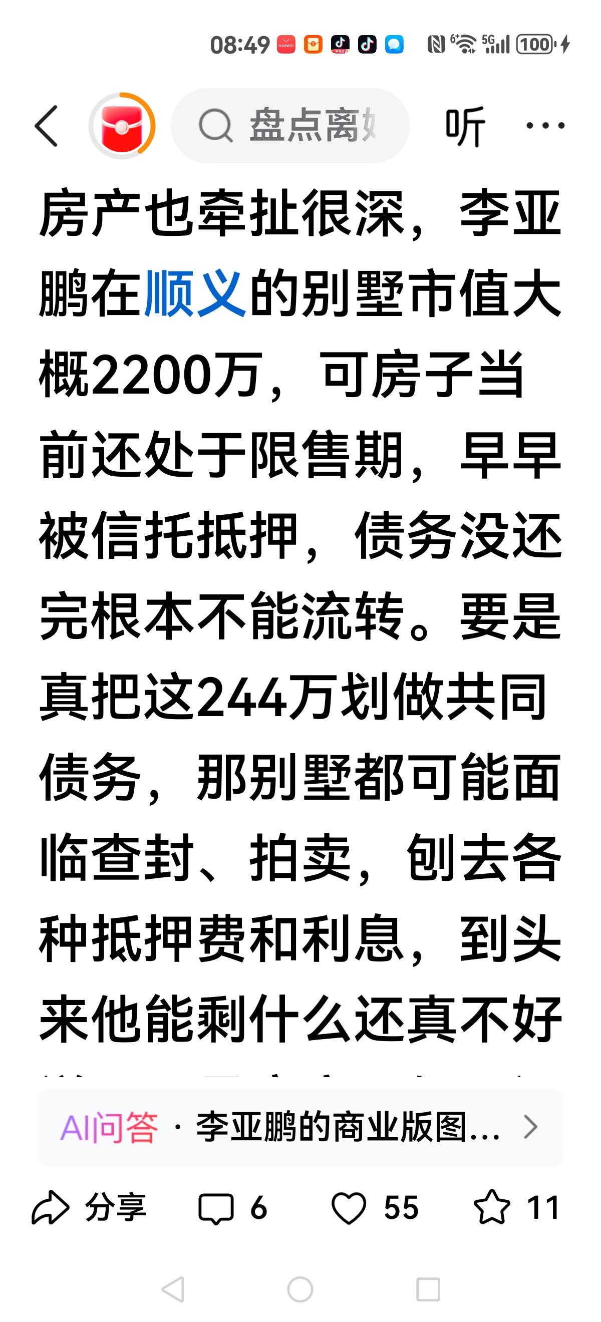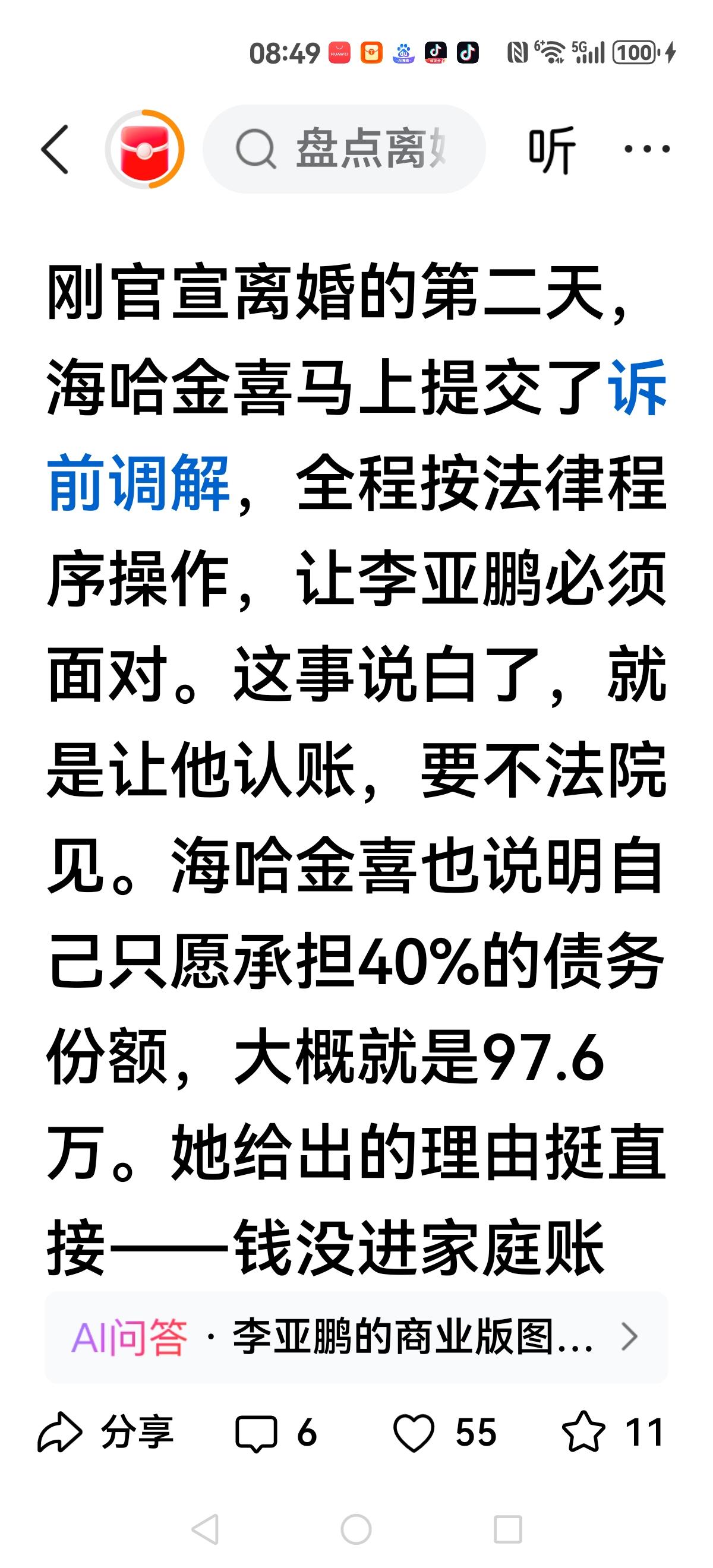 【244万债务】 离婚官宣后,法院公告有一则调解公告,原来是李亚鹏夫妻的。 244万债务,是婚后才有的,那么前妻律师声称这笔债务没有拿回家供养家庭,去向不明,因而前妻不用承担,但出于夫妻之间发生的,愿意承担40%,也就是97万。 看来这次离婚确实为了切割债务,李亚鹏的带货直播不及罗永浩,人家罗永浩真还传,偿还6个亿,而李亚鹏却又有244万。 离婚可能是无奈选择,再爱也不能眼看雪球越滚越大。 再一次验证王菲的选择,卖掉别墅,偿还外债后选择离婚。