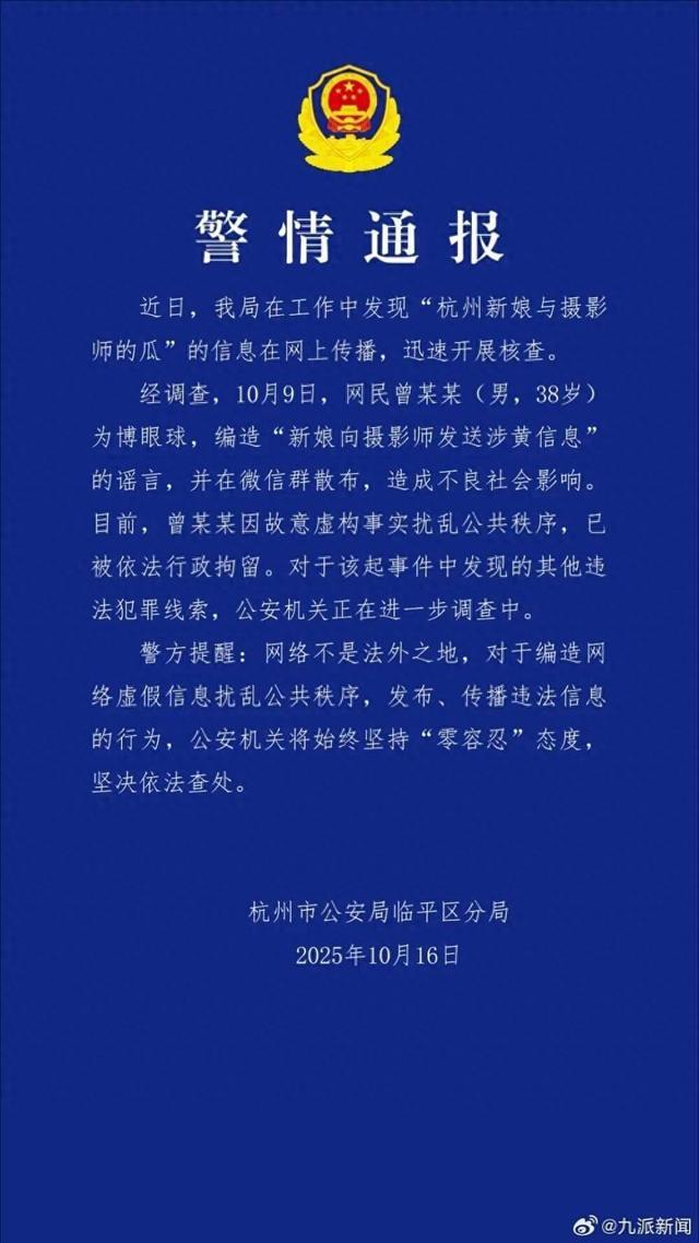 编造谣言“杭州新娘与摄影师的瓜”?警方通报:行拘!