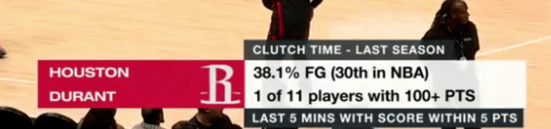 比赛现场转播方打出字幕,上赛季火箭在关键时刻(比赛最后5分钟分差5分之内)投篮命中率只有38.1%,排名联盟最后一位。