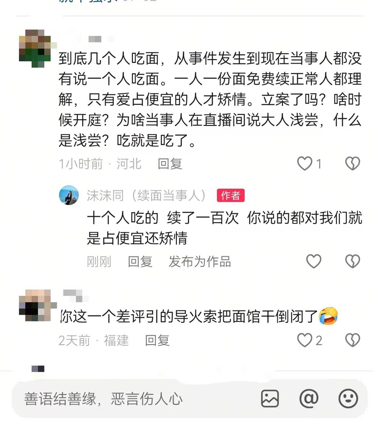今年8月份,郑州一面馆老板因续面问题将马女士及其孩子的视频发布至网络。视频中,该老板发布的“只点了一碗面”“顾客消费70余元”等言论,引起轩然大波,导致顾客马女士及家人被网暴。之后,马女士晒出140余元的账单还击,舆论纷纷倒戈,面馆被迫关停。