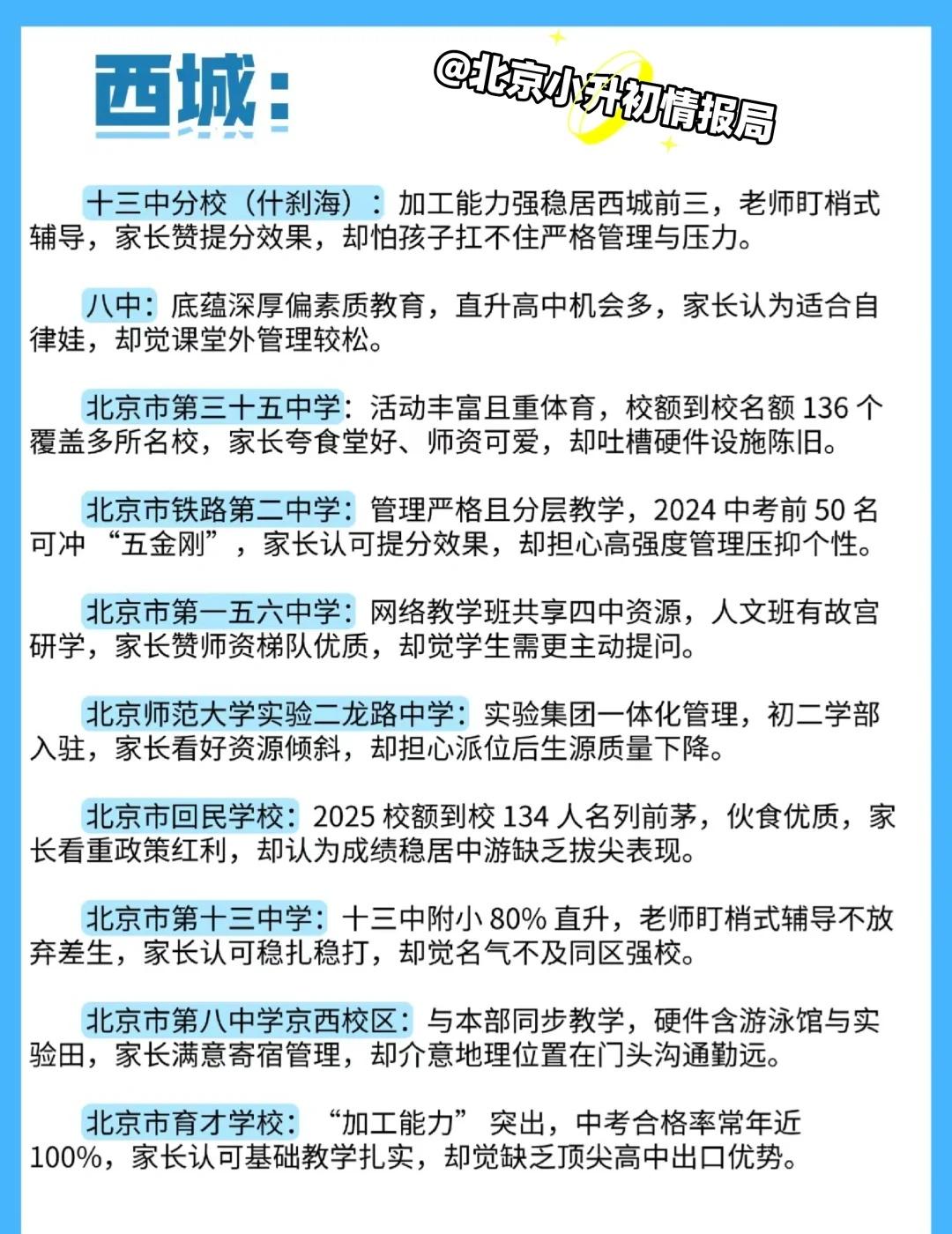 西城初中,2025年最新校情情况! 根据历年北京西城家长反馈的一些初中校真实情况! 择校 多元升学途径 名校 西城妈妈 西城 西城初中 西城小升初 西城家长