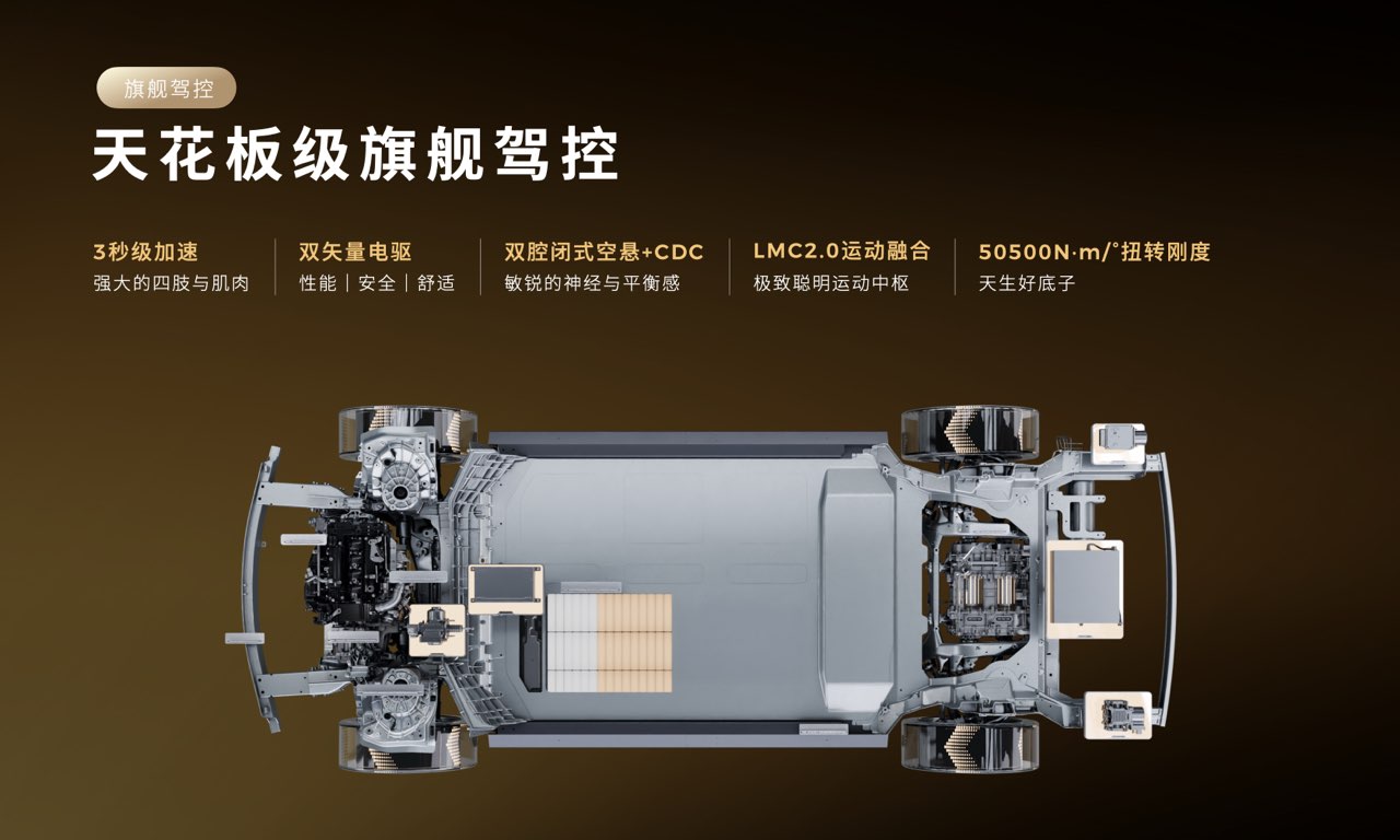 智能上,首发双高通骁龙8797中央域控,提供1280TOPS顶级算力,行业首发的舱驾一体融合架构,能降低延迟、提升稳定性。