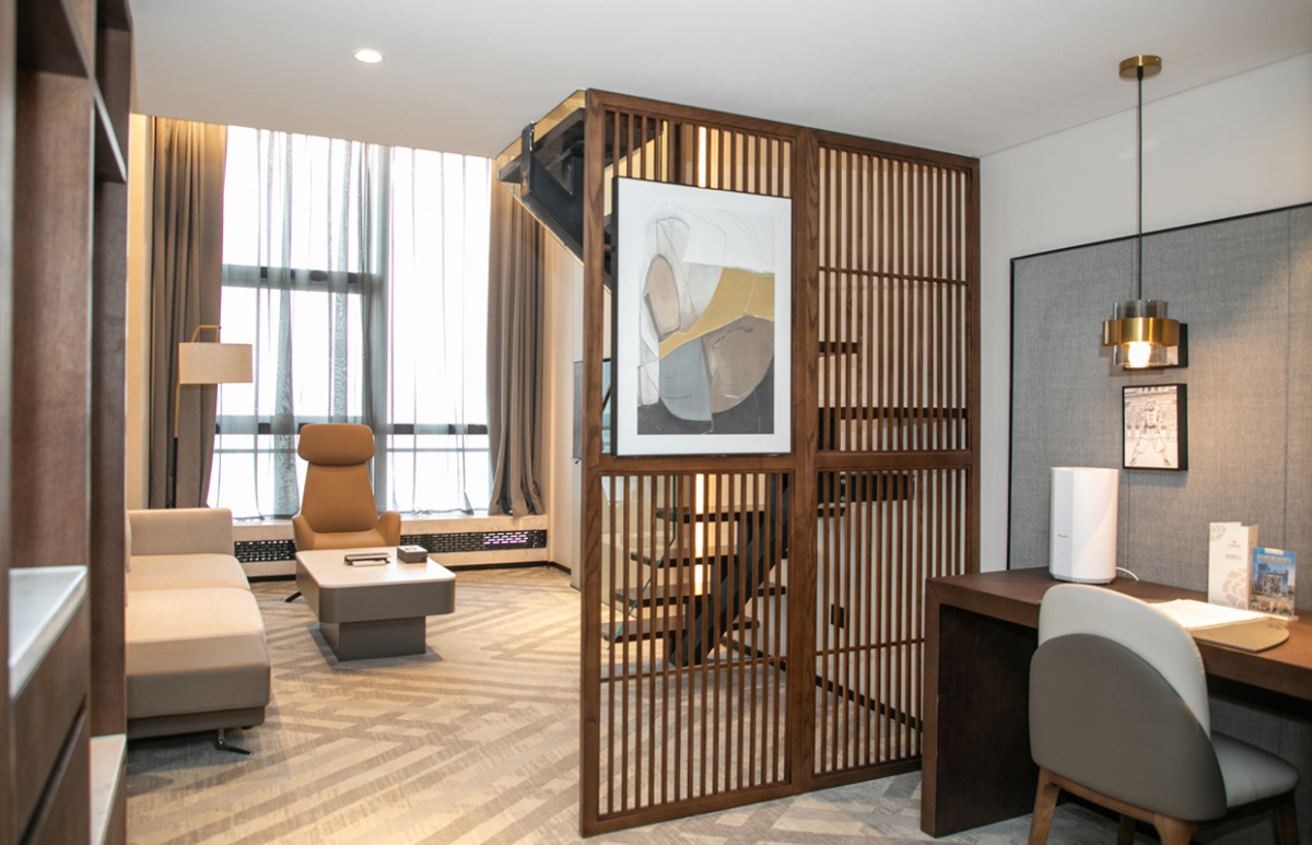※特色场景:流线型独特外立面,立体线条折射都市流光;外广场矗立先锋艺术装置,构建现代美学外景;特色复式客房与行政复式套房,承袭微型别墅立体空间的精髓,木雕横栏贯穿新中式美学空间。