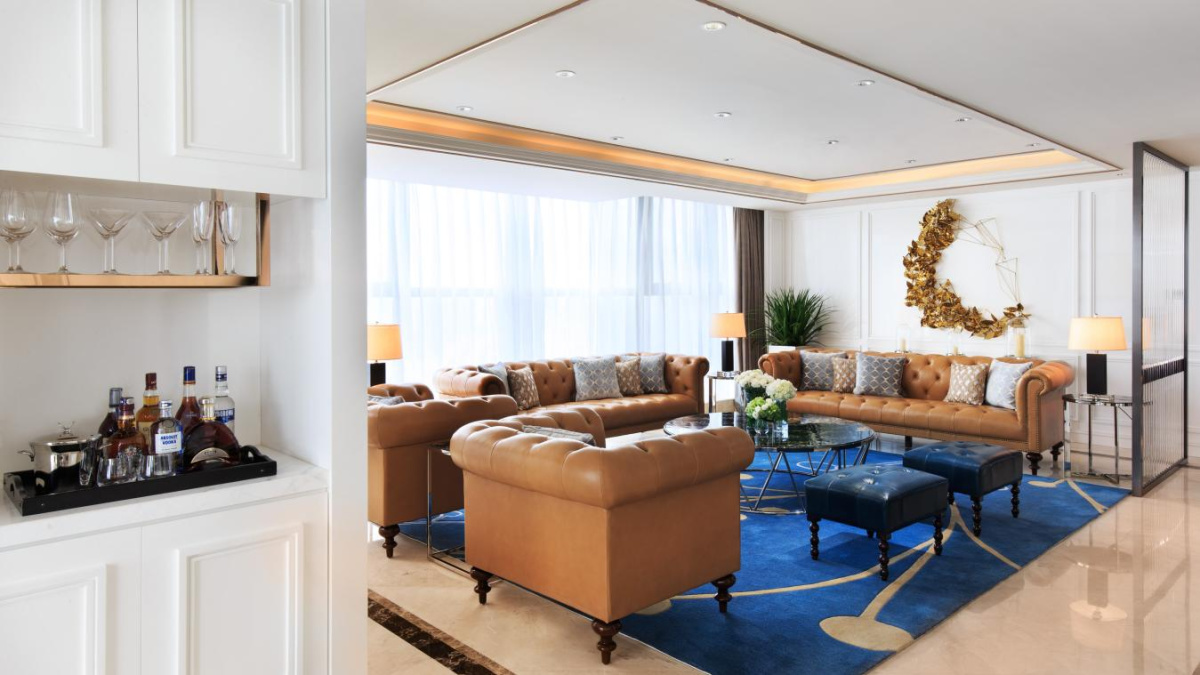 ※特色场景:大堂休息区兼具舒适与美感;标志性的旋转步梯宛若一件流动的艺术品;行政酒廊优雅开阔,全景落地窗俯瞰城市风貌;宴会厅配备专业灯光音响设备和巨幅LED屏,豪门婚礼、商业晚宴、新闻发布会、明星颁奖礼等随心变幻;复古优雅的雪茄吧,真皮沙发砌起慵懒而隐秘的角落;高端商务的KTV豪华包房;亲子/儿童房充满温馨童趣。