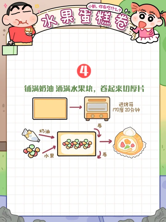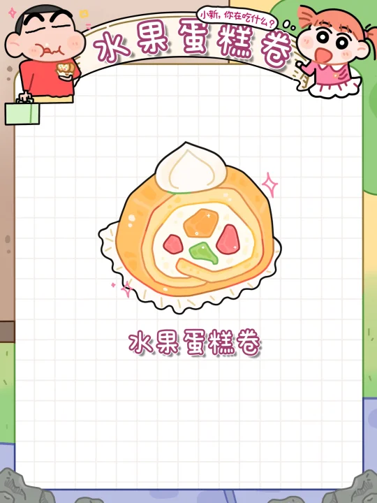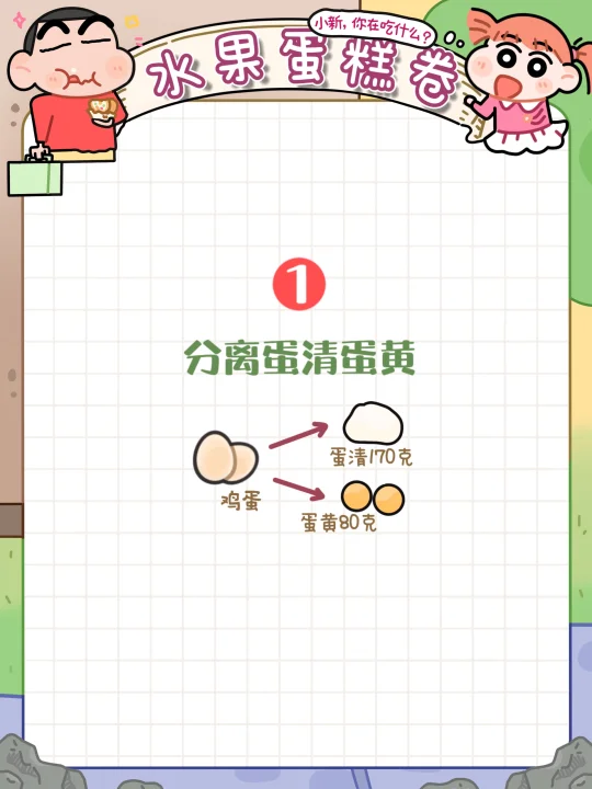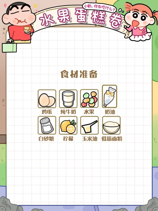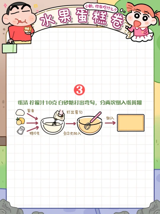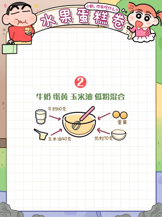 就是各种蛋液➕面粉➕牛奶🥛搅一搅就能完美复刻蜡笔小新同款水果浮云卷🖍️啦~
