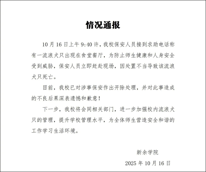 目前,新余学院已对涉事保安作出开除处理,并对此事造成的不良后果深表遗憾和歉意!