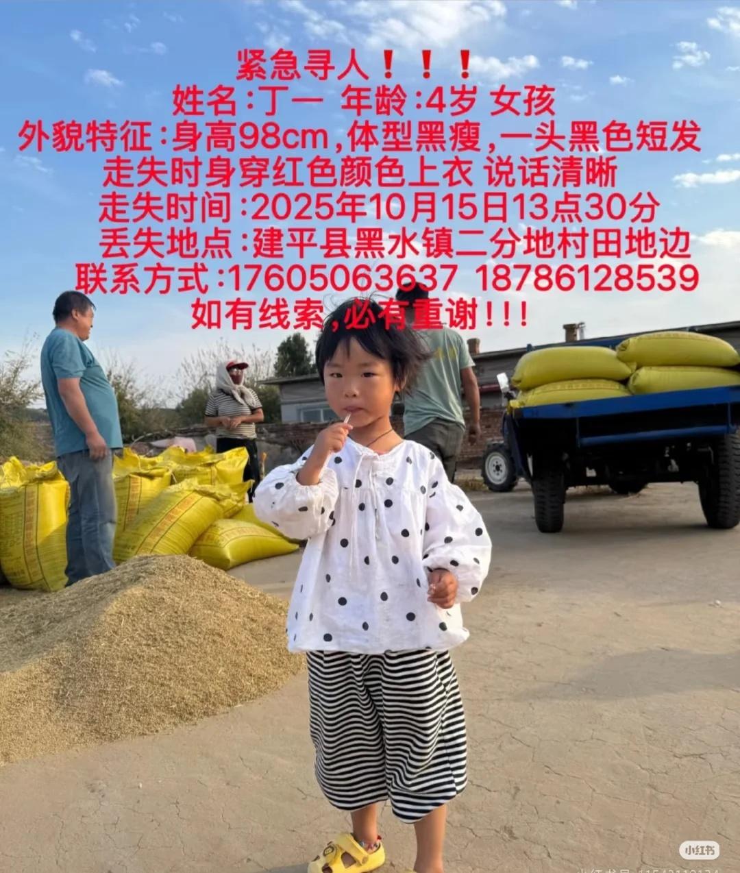 寻人 帮扩散 姓名:丁一,性别:女,年龄:4岁外貌特征:身着红色上衣,肤色偏黑,于2025年10月15日下午1点半左右,在建平县黑水镇二分地村田地间走失,经多方寻找,现在仍无任何消息,如有知情者请联系。 电话:17605063637 13614912015 如有好心人捡到孩子并送回,家属愿送现金10万元 10月15日,多位网友发布寻人启事称,15日下午1点半,辽宁朝阳市建平县黑水镇大营子村一名4岁女童小壹(化名)在地头失踪。10月16日,建平县黑水镇派出所民警表示,当地已组织500余人进行寻找,包括村镇各相关单位、公安机关、救援队,还有相邻的内蒙古自治区的村也组织村民帮助寻找,目前还在积极寻找中。 10月16日上午,记者联系到小壹的爷爷丁大爷,据他介绍,因为小壹的父母都在外打工,小壹一直由爷爷奶奶照看。15日12点35分左右,丁大爷和老伴驾驶一辆面包车载着小壹去地里干活,因为小壹在车里睡着了,丁大爷便将小壹留在了车里。干活约20分钟后,丁大爷到车里查看,发现小壹还在睡觉,便继续下地干活。直到下午1点半,丁大爷回到车旁放东西,却发现车里的小壹不见了,车门没有打开,但原本关着的车窗被打开了。 小壹的父亲丁先生15日下午接到消息后紧急从贵州赶了回来。丁先生称,当地出动了无人机、搜救犬等多种救援力量,将走失地点2公里范围内进行了仔细寻找,却没有发现任何线索,目前还在进一步扩大寻找范围。丁先生告诉记者,小壹的妈妈正在从贵州回建平的路上。“事情刚发生的时候没敢告诉她,今天早上她知道情况以后立即往回赶。” 小壹身高1米左右,短发,肤色偏黑,口齿比较清楚,失踪前身穿红色呢子上衣,蓝色牛仔裤和白色的鞋。小壹的失踪让全家人都非常焦急,采访中,小壹的爷爷丁大爷表示,若有人能将小壹找到并带回,他愿意支付10万元报酬。寻人启事 希望每个孩子都被保护 寻人 真实故事 真实案件 热点 关注儿童安全 孩子安全无小事 好人一生平安