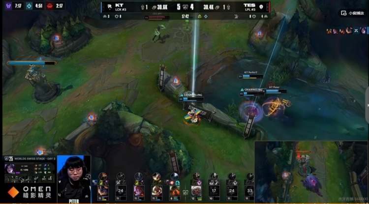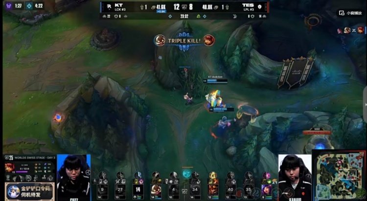 [22:51]龙魂团,Peter泰坦一钩配合兰博大招直接融化掉了Kanavi皇子!正面KT拿下小龙!Hang妮蔻坐大进场还被金身规避!正面2换2之后369安蓓萨大招配合Creme安妮击杀Cuzz猴子,但是几乎满状态的Deokdam库奇追击三杀收尾!KT打出2换5团灭TES!