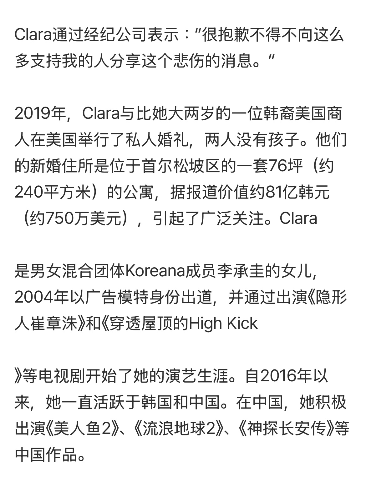 克拉拉与韩裔美国商人结婚六年后离婚。