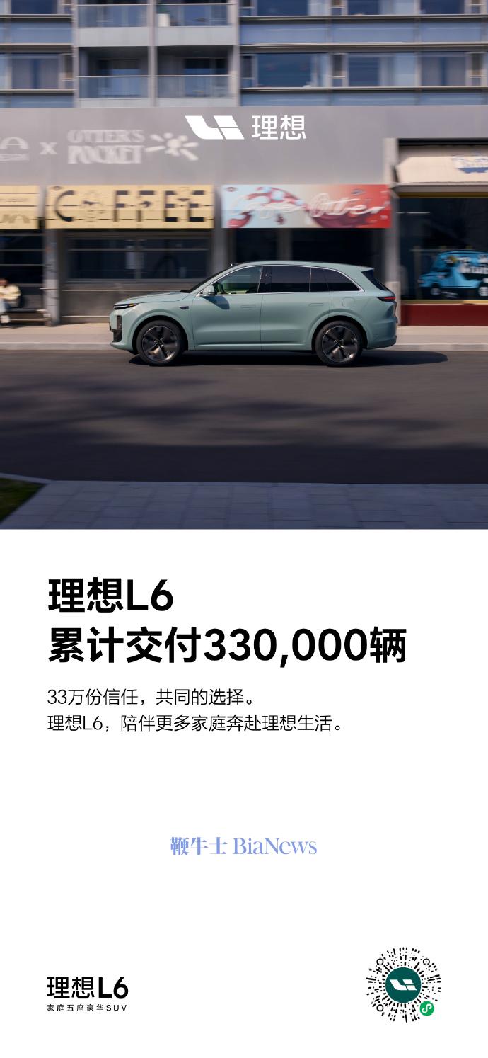 今日,理想汽车官方宣布,理想L6累计交付已突破33万辆。