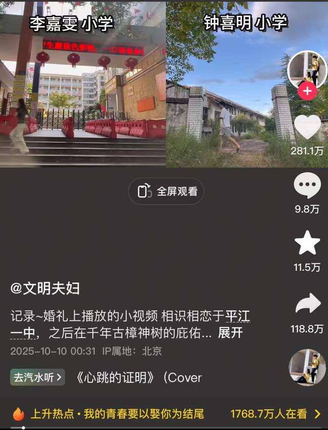 视频中,来自岳阳平江的钟喜明和李嘉雯讲述了他们从校服到婚纱、长达九年的爱情长跑,而家乡一棵千年古樟树则成为了他们爱情的特殊“证婚人”。