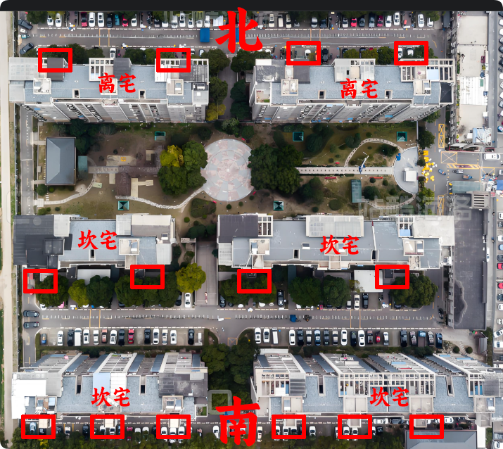 如上图某小区俯视图,通过红色方框位置为单元门出入口,我们可以以此来确定该单元楼的坐向,以此来确定具体的宅型。