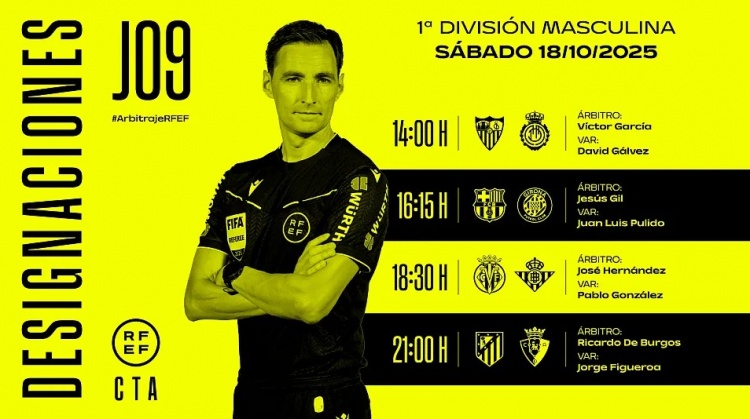 西甲第9轮部分场次裁判安排(开球时间为北京时间):