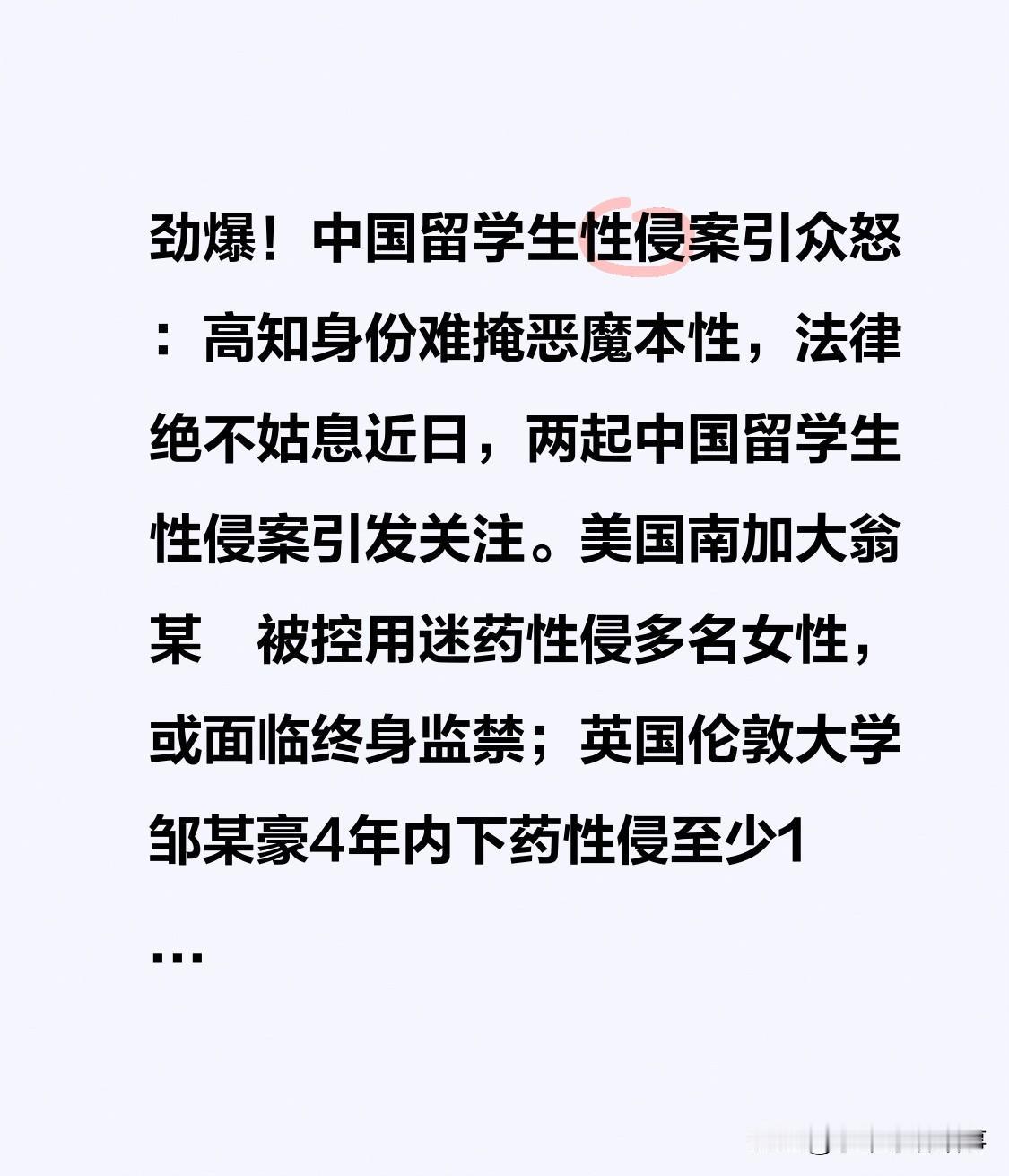 震惊!中国留学生性侵案激起公愤:高知光环难掩恶魔行径,法律绝不轻饶 近日,两起中国留学生性侵案备受瞩目。美国南加大翁某喆被控迷药性侵多名女性,恐面临终身监禁;英国伦敦大学邹某豪4年内下药性侵至少10人,还拍摄视频,被判终身监禁,最低服刑24年。高学历者竟行此恶行,法律面前无例外,严惩罪犯,守护安全! (来源:警方通报) 性侵案 性侵犯罪 伦敦性侵案