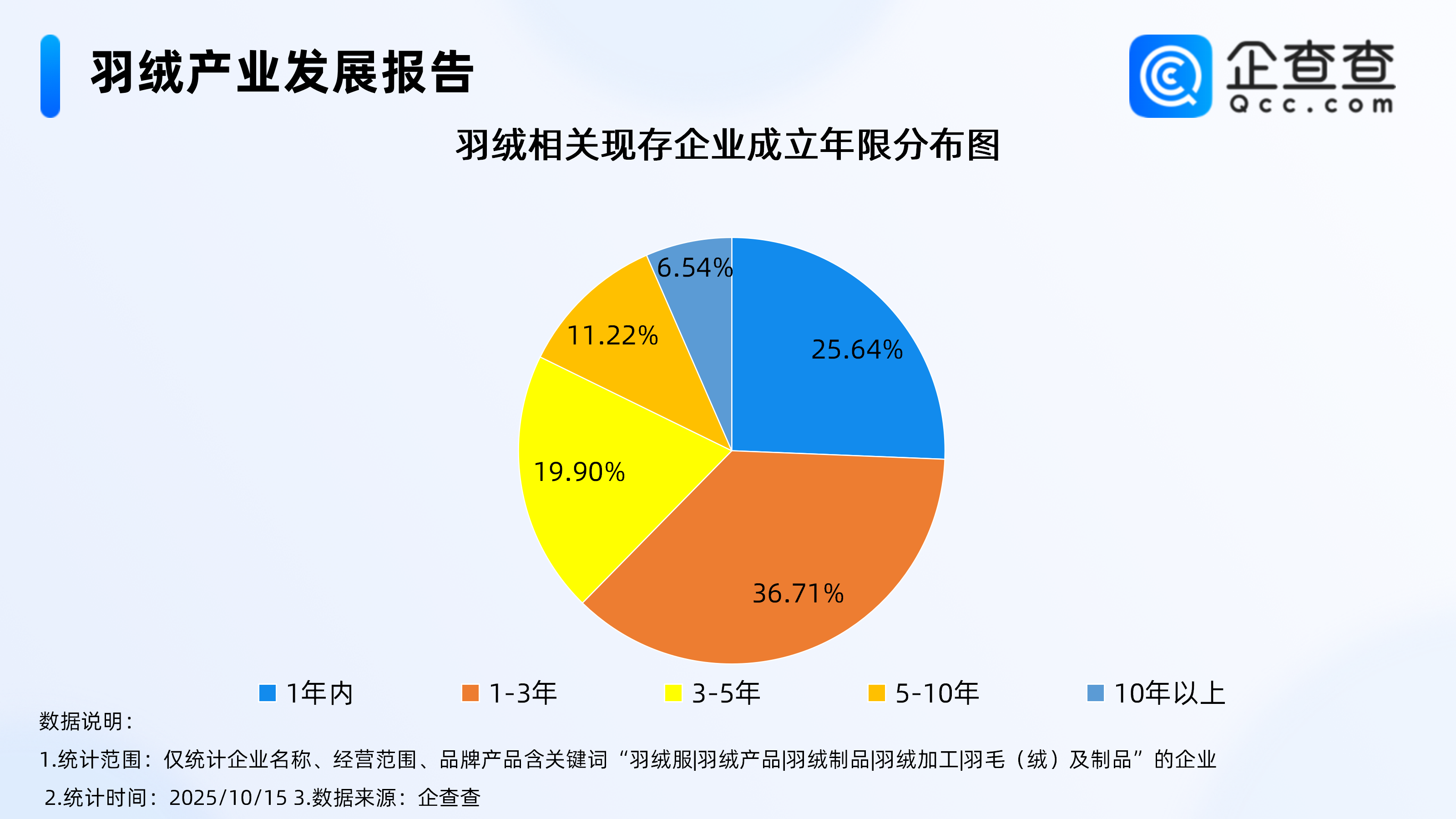 企查查数据显示,从成立年限上看,国内羽绒相关现存企业中,超6成相关企业成立于近3年,其中成立年限在1-3年的相关企业最多,占比达36.71%,成立于1年内的相关企业,占比达25.64%。