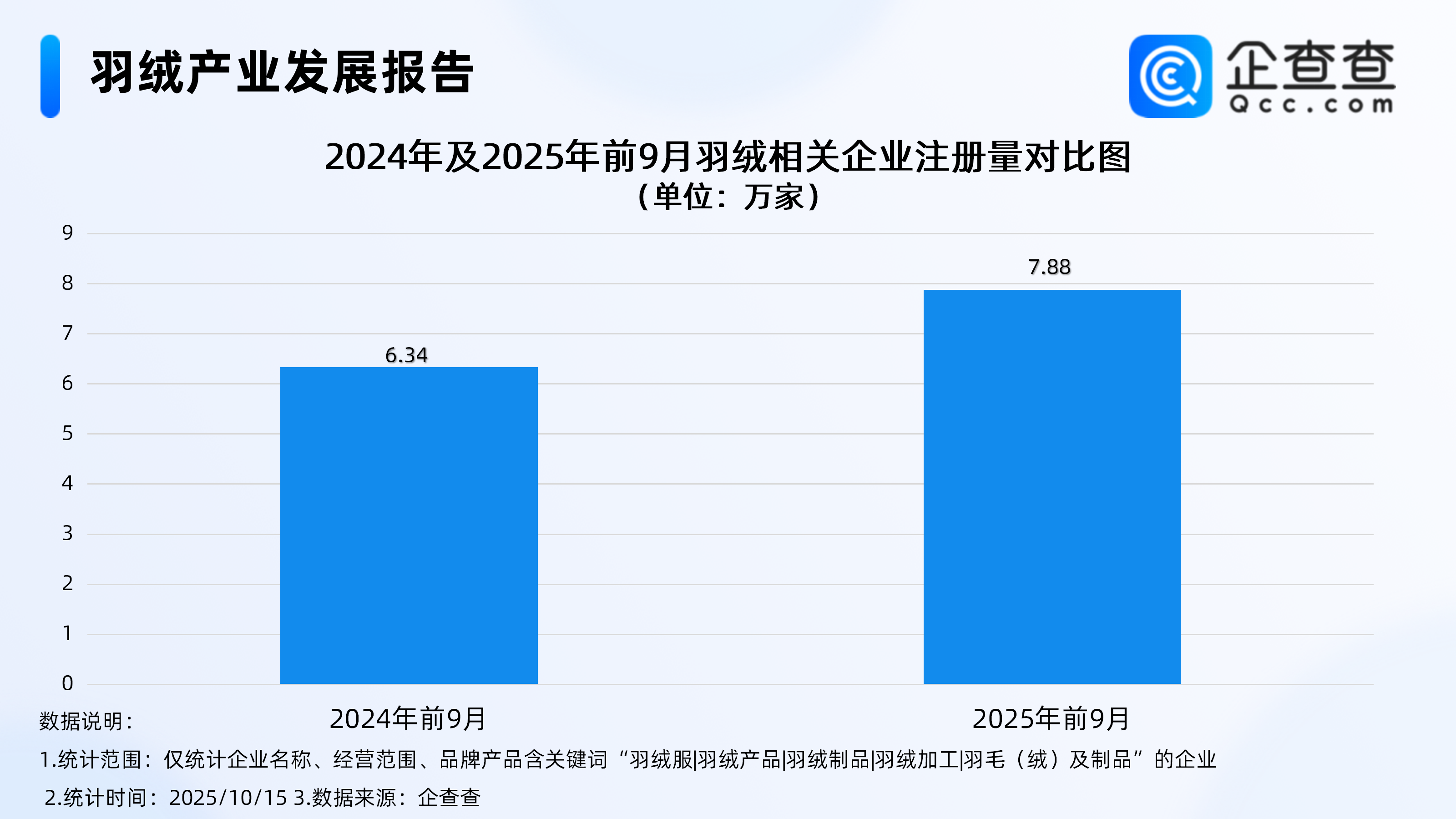 企查查数据显示,注册量方面,近十年羽绒相关企业年注册量整体上升趋势,2024年注册量达8.41万家,截至目前,今年已注册8.1万家,其中前9月注册量达7.88万家,同比增长24.37%。