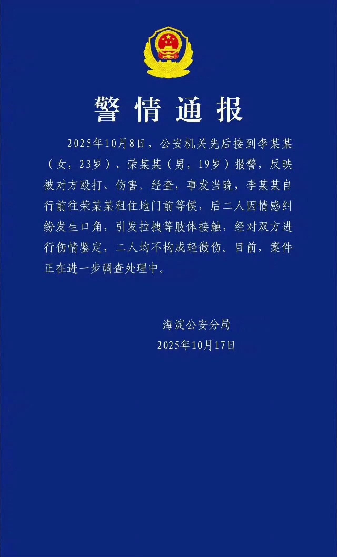 海淀公安分局先后接到李禹熹荣梓杉报警被对方殴打、伤害,经对双方进行伤情鉴定,二人均不构成轻微伤。